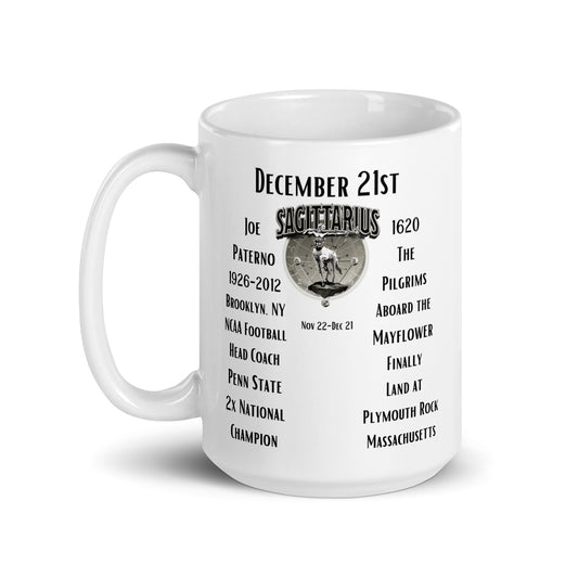 On This Day: Birthday Series - December 21 - (D) Joe Paterno & the Pilgrims - White glossy mug
