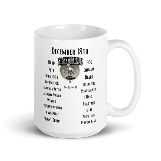 On This Day: Birthday Series - December 18th - (A) Brad Pitt & NFL's 1st Playoff Game - White glossy mug