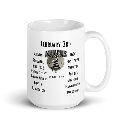 On This Day: Birthday Series - February 03rd - (A) Norman Rockwell & 1st Paper Currency - White glossy mug