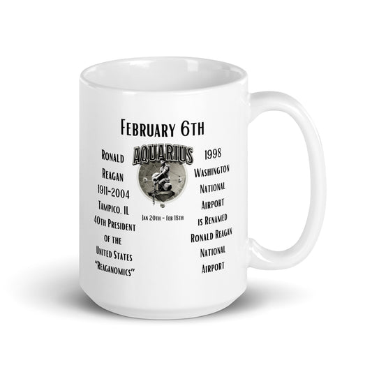 On This Day: Birthday Series - February 06th - (A) Ronald Reagan & Ronald Reagan National Airport - White glossy mug