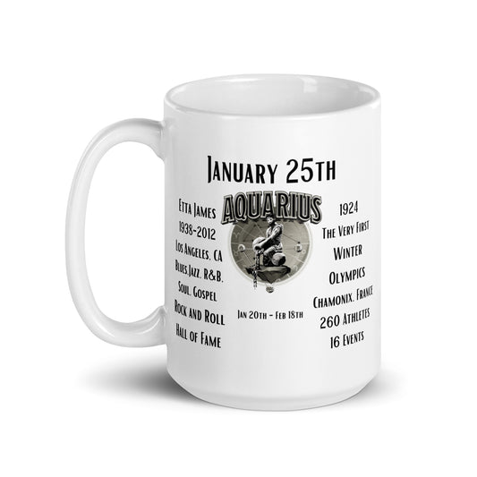 On This Day: Birthday Series - January 25th - (B) Etta James & The 1st Winter Olympics - White glossy mug
