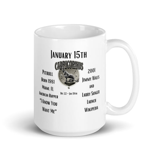 On This Day: Birthday Series - January 15th - (C) Pitbull & Wikipedia - White glossy mug