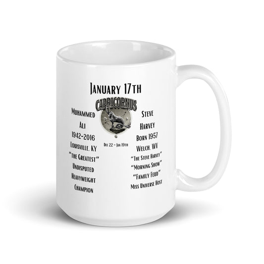 On This Day: Birthday Series - January 17th - (A) Muhammed Ali & Steve Harvey - White glossy mug