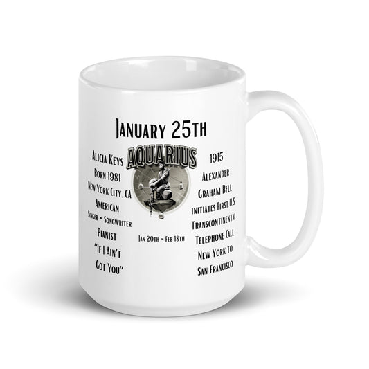 On This Day: Birthday Series - January 25th - (A) Alicia Keys & 1st U.S. Transcontinental Phone Call - White glossy mug