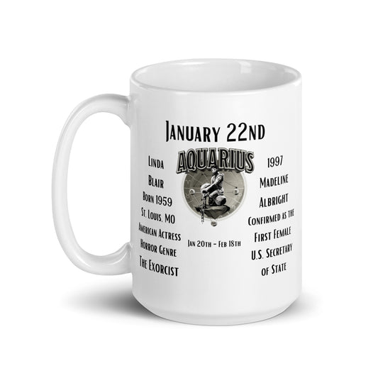 On This Day: Birthday Series - January 22nd - (B) Linda Blair & Madeline Albright - White glossy mug
