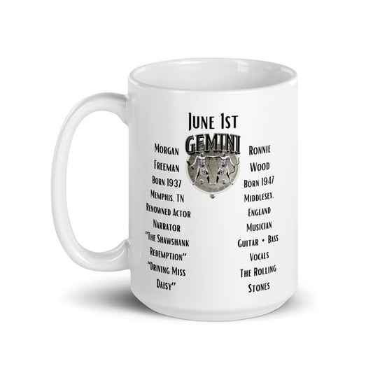 On This Day: Birthday Series - June 01st - (B) Morgan Freeman & Ronnie Wood - White glossy mug
