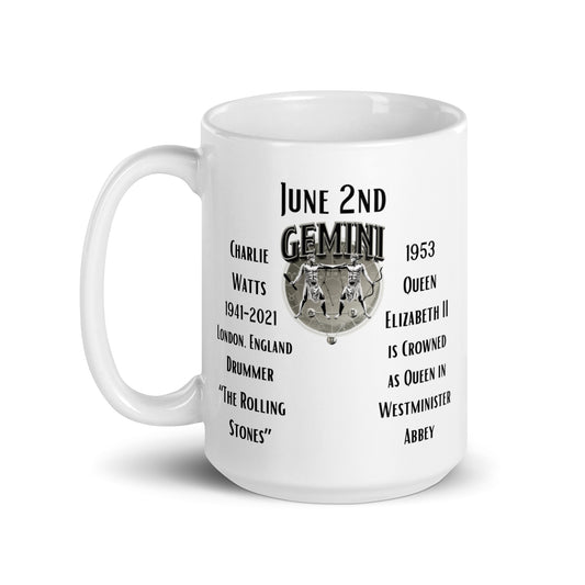 On This Day: Birthday Series - June 02 - (B) Charlie Watts & Queen Elizabeth II - White glossy mug