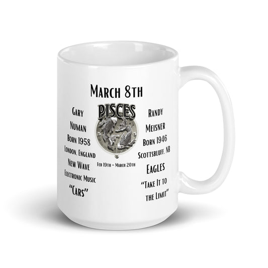 On This Day: Birthday Series - March 08th - (A) Gary Numan & Randy Meisner - White glossy mug