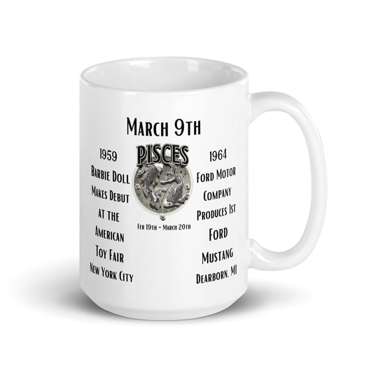 On This Day: Birthday Series - March 09th - (A) Barbie Doll & Ford Mustang - White glossy mug