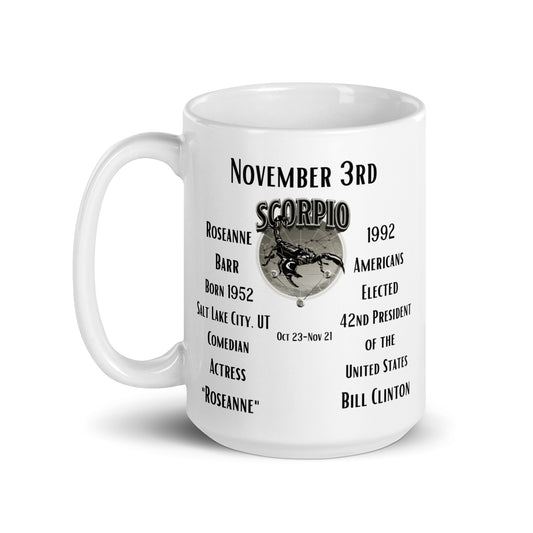 On This Day: Birthday Series - November 03rd - (B) Roseanne Barr & Bill Clinton - White glossy mug