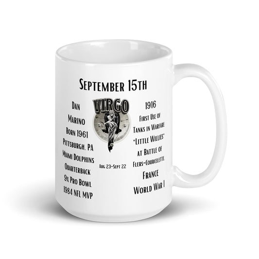 On This Day: Birthday Series - September 15th - (A) Dan Marino & First Use of Tanks - White glossy mug