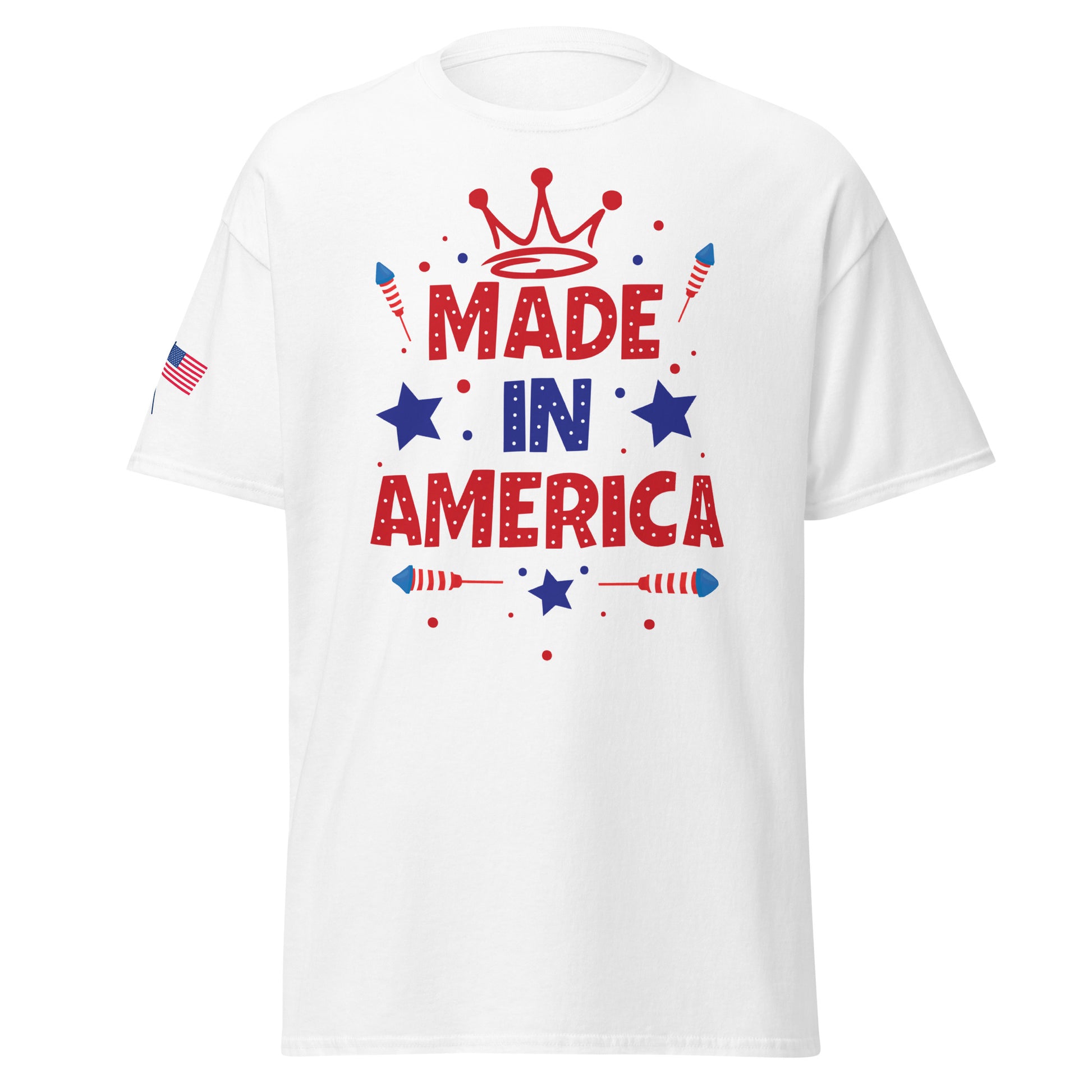 Show your patriotic pride with our "MADE IN AMERICA" 4th of July t-shirt. Featuring the text "MADE IN AMERICA" and an image of two crossed American flags on the right shoulder, this shirt is a perfect way to celebrate Independence Day and showcase your American spirit. The bold design, with its vibrant red, white, and blue colors, pays homage to the Stars and Stripes, symbolizing the values of freedom, liberty, and unity. Made from high-quality materials, this t-shirt offers comfort and durability, making it suitable for all-day wear during your 4th of July festivities. Whether you're attending a BBQ, watching fireworks, or simply spending time with loved ones, this shirt is a stylish and meaningful choice. Wear it with pride and let everyone know that you're proud to be a part of this great nation. Celebrate the spirit of America with our "MADE IN AMERICA" 4th of July t-shirt and showcase your patriotic pride in style.