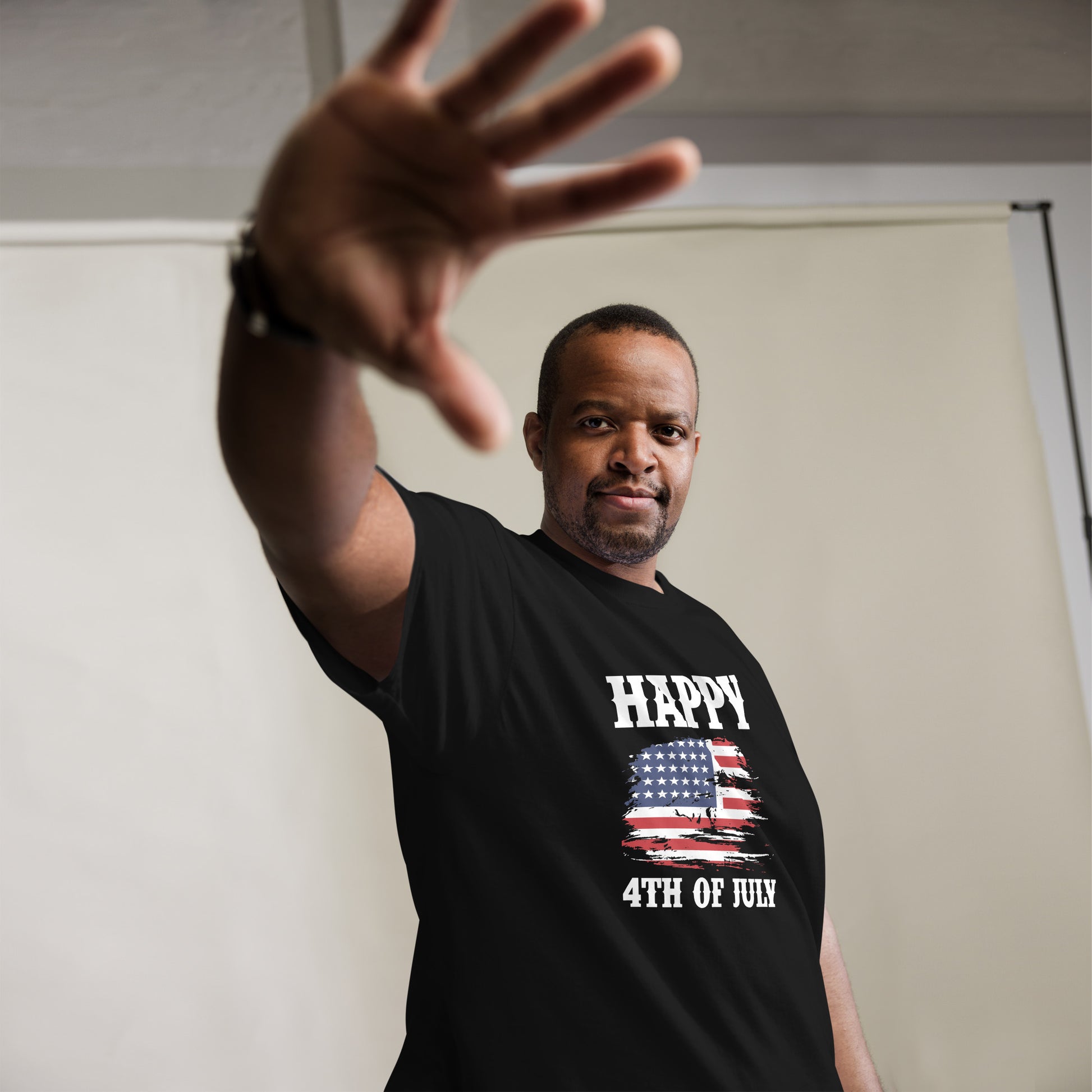 Celebrate the 4th of July in style with our "Happy 4TH OF JULY" t-shirt. This patriotic shirt features the text "Happy 4TH OF JULY" along with an eye-catching image of the American flag, proudly displaying the Stars and Stripes in vibrant red, white, and blue. The shirt is designed with a unique twist, as it also showcases a patriotic tongue on the right shoulder, adding an extra element of fun and festive spirit. Made from high-quality materials, this t-shirt offers comfort and durability, making it perfect for all your 4th of July celebrations. Whether you're attending a fireworks display, hosting a backyard BBQ, or enjoying time with friends and family, this shirt will show off your patriotic pride and love for your country. Wear it with joy and let your enthusiasm for Independence Day shine through. Celebrate the spirit of freedom and liberty with our "Happy 4TH OF JULY" t-shirt, and make a bold patriotic statement wherever you go.