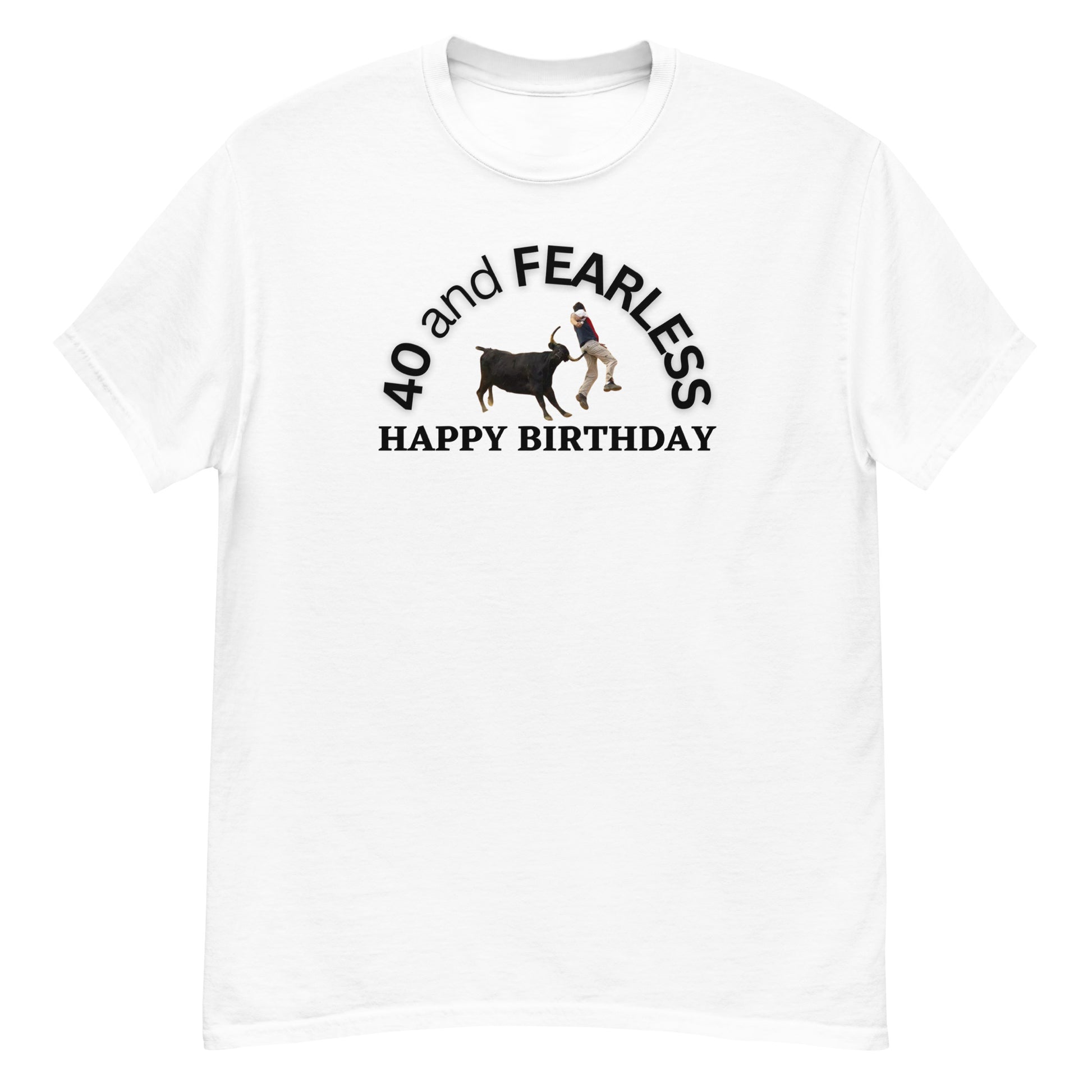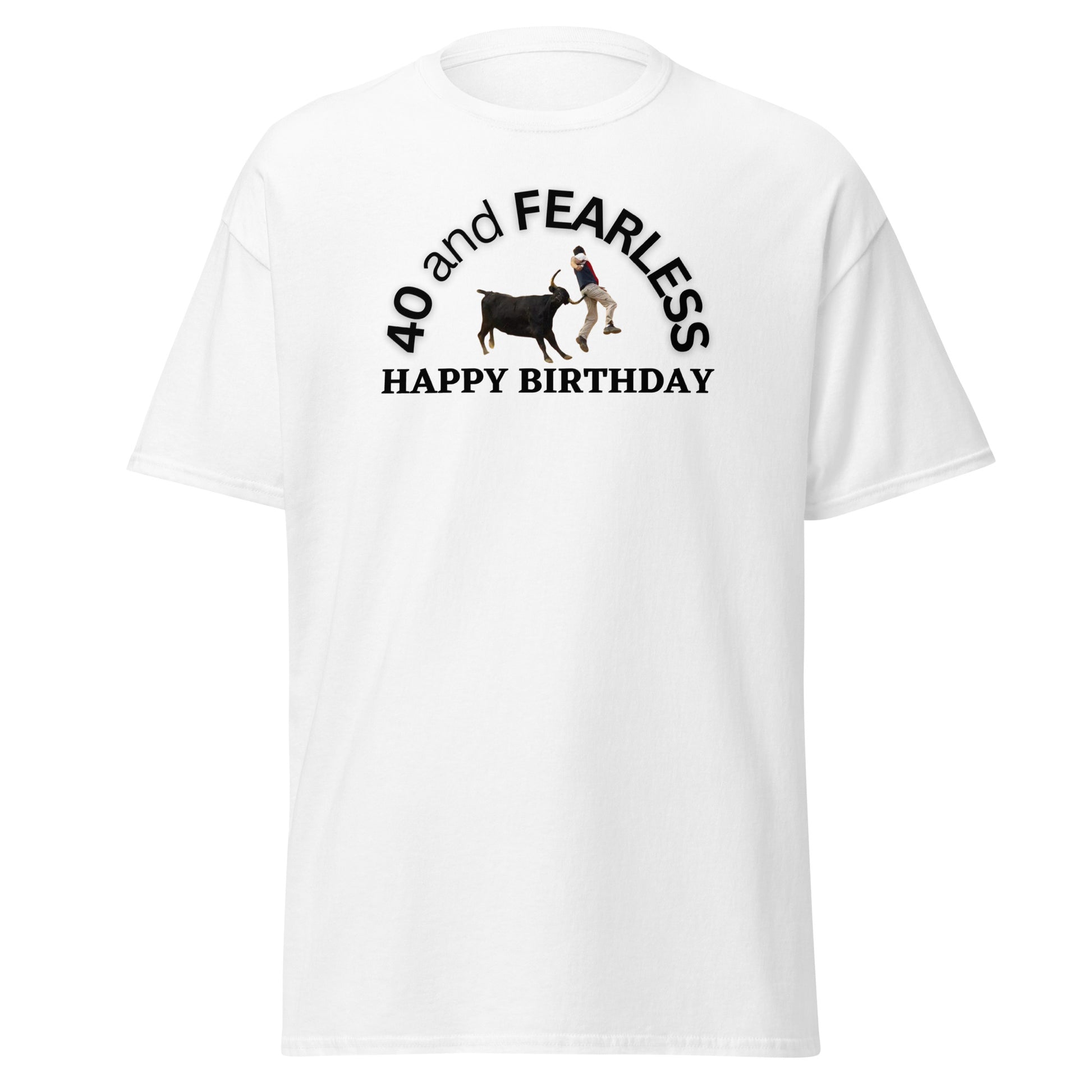 Embrace your milestone 40th birthday with our Benchmark Birthdays T-shirt! Featuring the bold statement "40 and FEARLESS" and an eye-catching image of a powerful bull lifting a man in the air with one of its mighty horns, this T-shirt is a perfect way to showcase your fearless spirit. Let the world know that age is just a number and you're ready to take on new adventures with confidence and courage. Made with high-quality fabric for comfort and durability, this T-shirt is an ideal birthday gift for yourself or a loved one. Wear it proudly and inspire others to embrace their own fearlessness. Celebrate turning 40 with style and a fearless attitude!