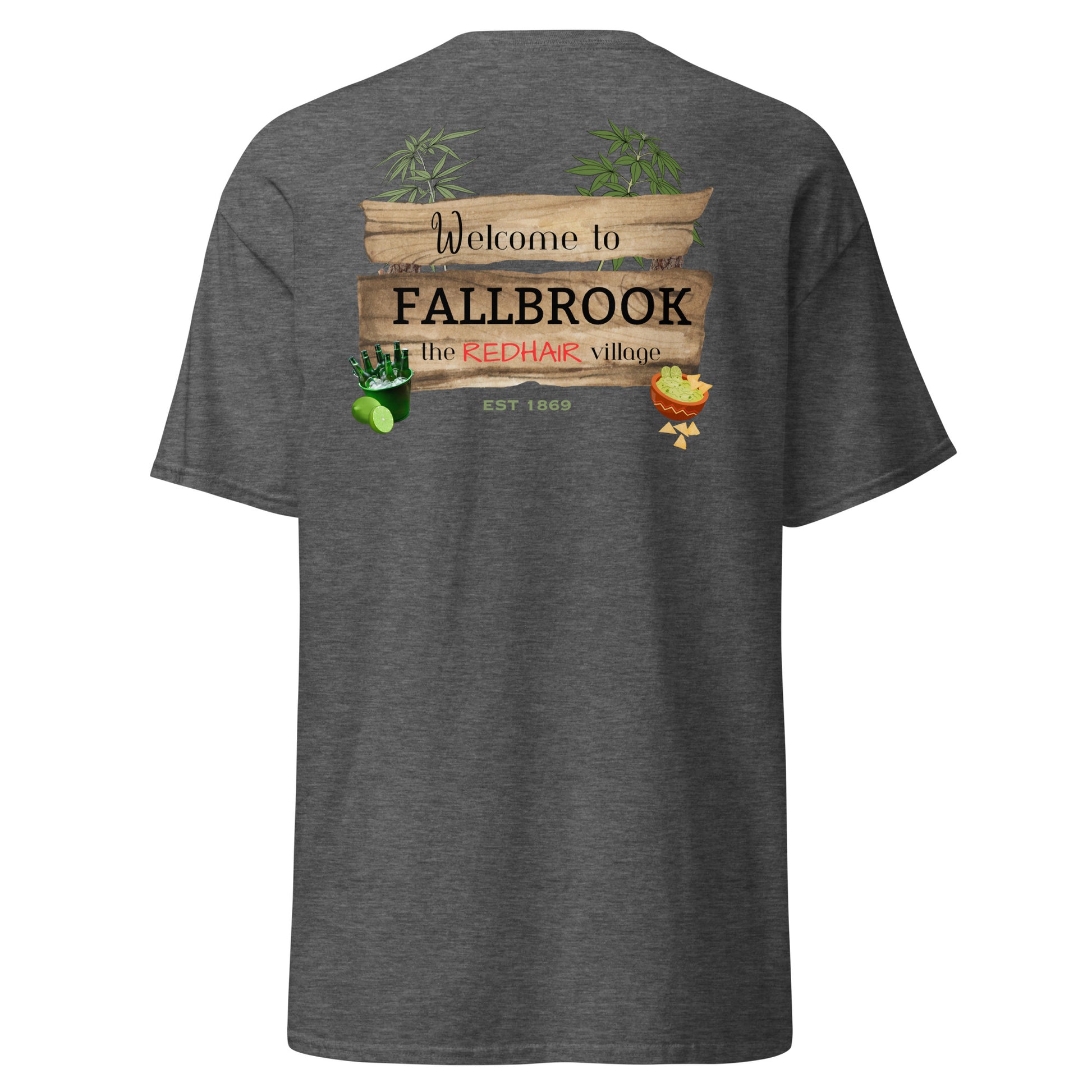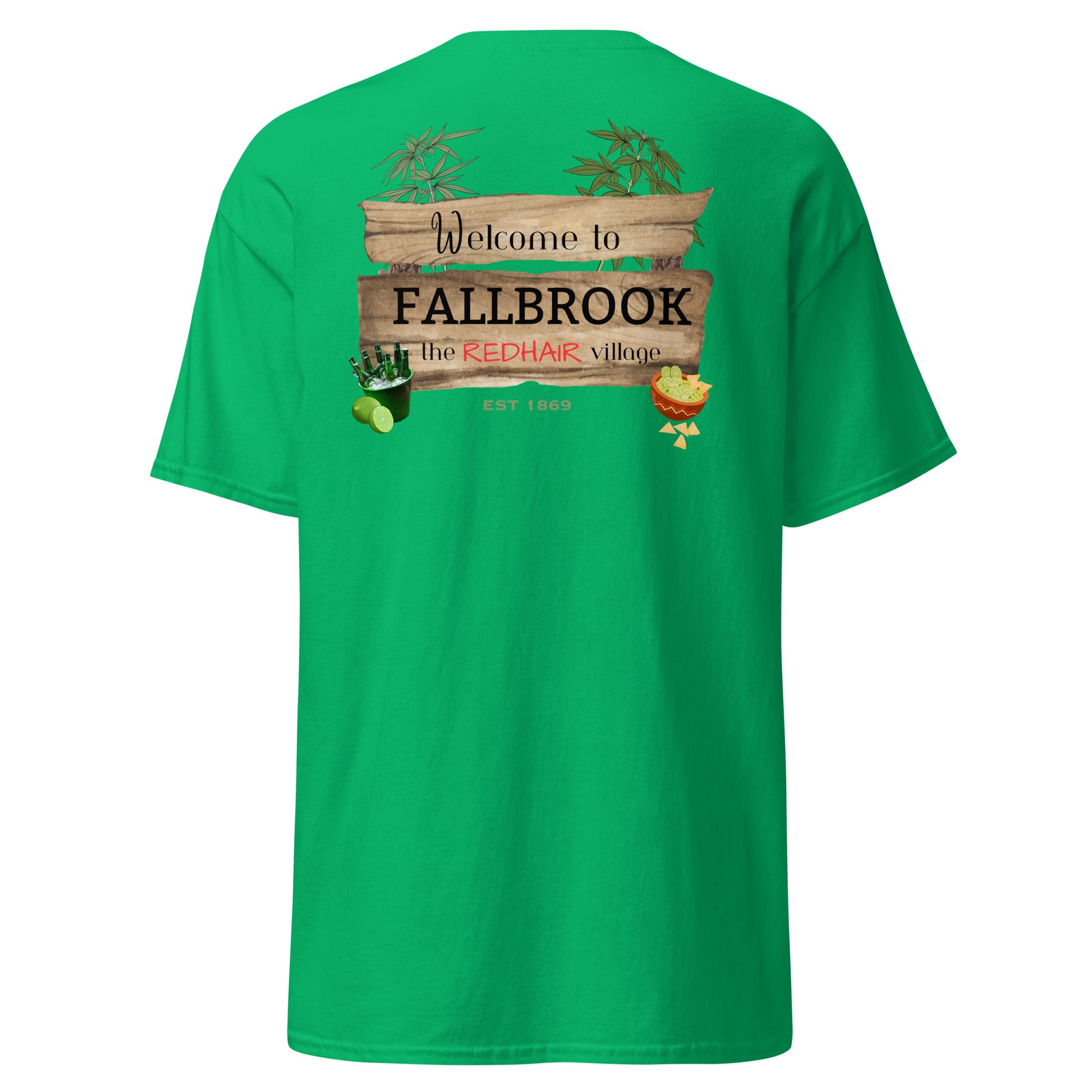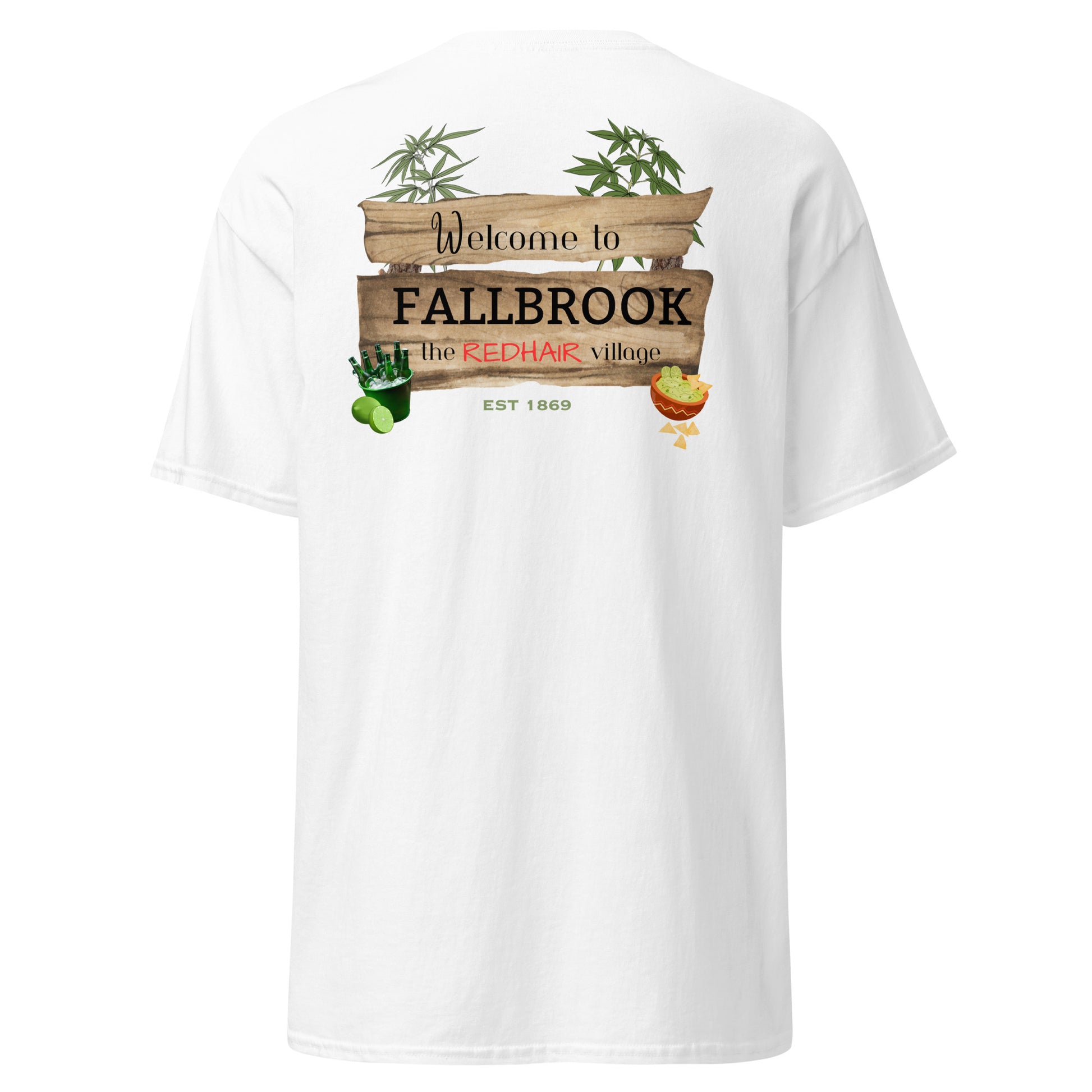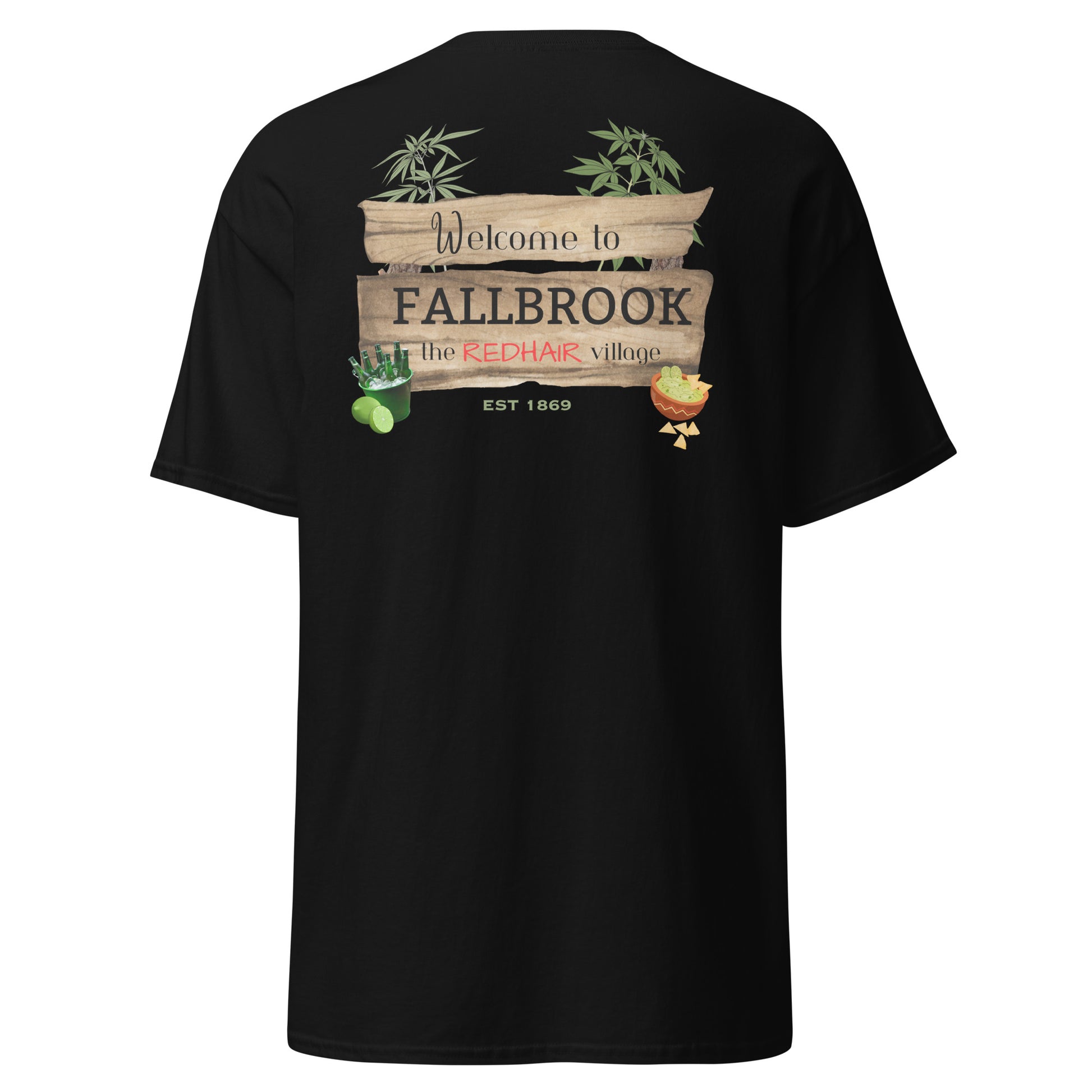 Step back in time with our Nostalgia Series T-shirt, proudly displaying the iconic text "Welcome to FALLBROOK the REDHAIR village". This design captures the essence of a bygone era, paying tribute to the spirited community of Fallbrook in the late 70s and early 80s. The phrase "REDHAIR" carries a playful double meaning, referencing both the mischievous alteration of the town's original sign and its reputation for cultivating exceptional marijuana. The image of a bowl of guacamole with chips represents Fallbrook's legacy as the avocado capital of the world, while the bucket of beers with a lime symbolizes the love for good times and camaraderie that defined the era. Crafted with a touch of nostalgia, this T-shirt is a perfect conversation starter and a unique piece of retro style. Wear it proudly and reminisce about the vibrant culture and memorable experiences of Fallbrook, the REDHAIR village.