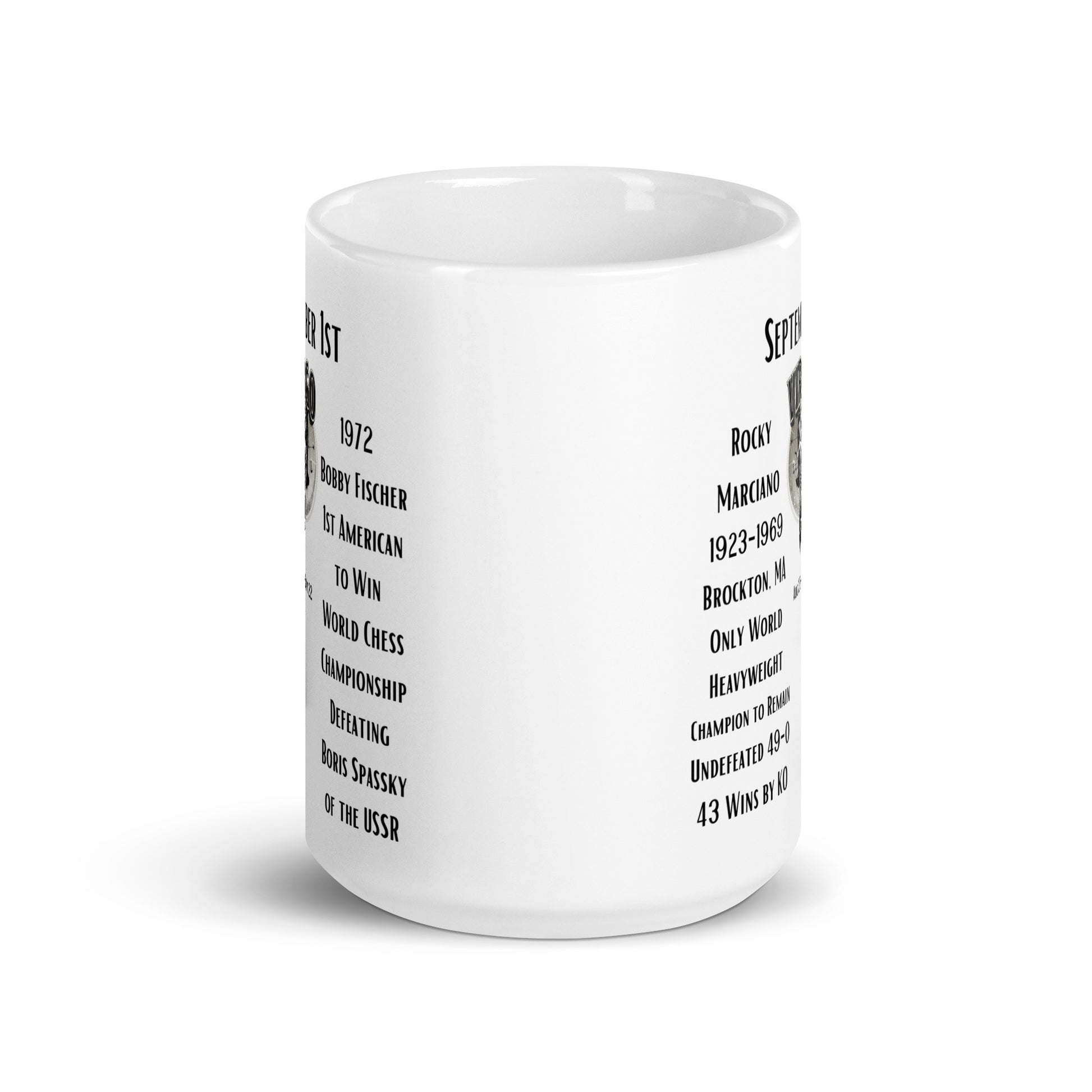 On This Day: Birthday Series - September 01st - (B) Rocky Marciano & Bobby Fisher - White glossy mug