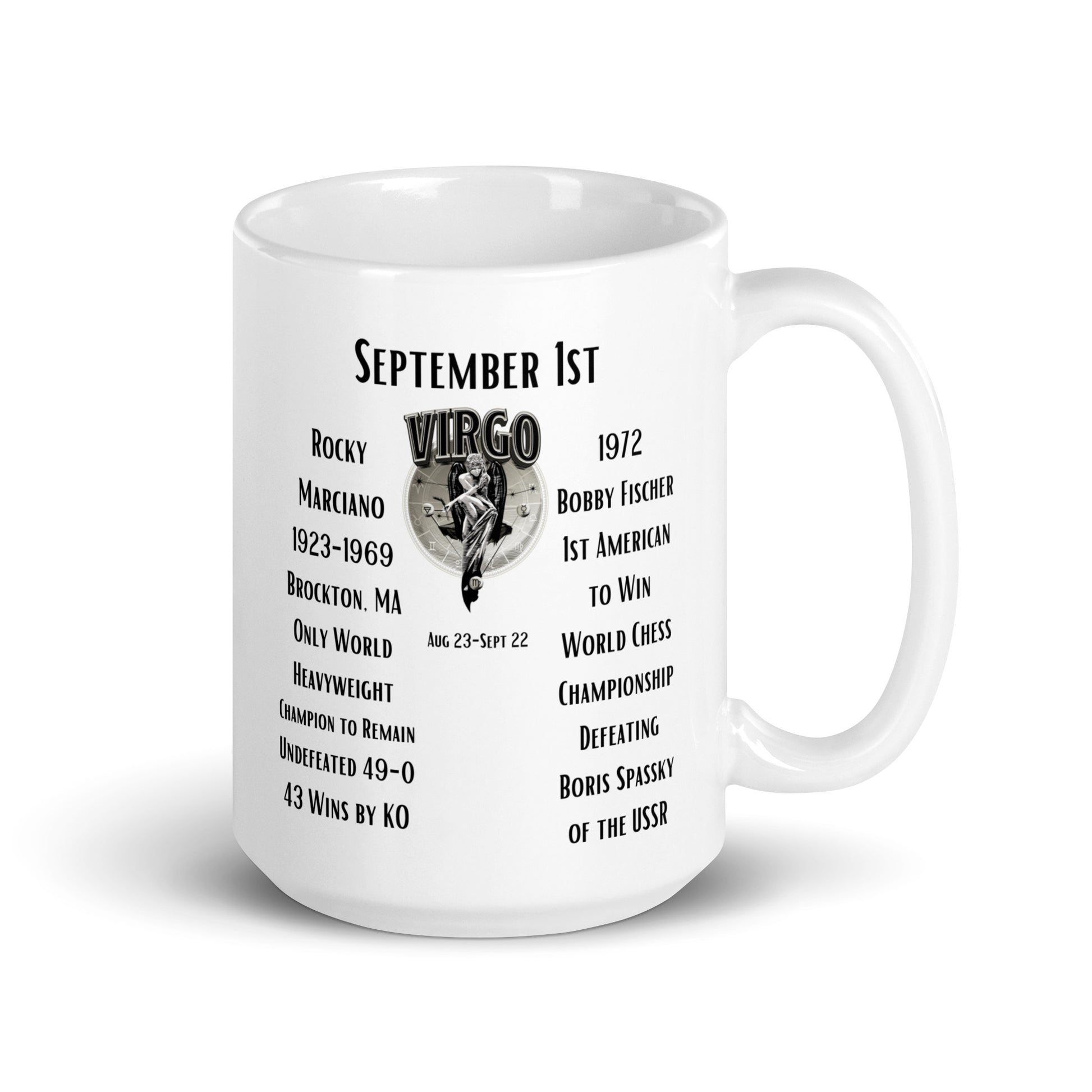 Celebrate your special day with our "On This Day Birthday Series" mug for September 1st! This unique mug commemorates notable events and people born on this day. On September 1st, we honor the birth of the legendary Rocky Marciano, one of the greatest heavyweight boxers in history. Additionally, this day marks the remarkable achievement of Bobby Fisher, who became the first American chess champion, showcasing his exceptional strategic skills. As a proud Virgo, you embody the traits of intelligence, precision, and determination. Enjoy your morning coffee or tea while reflecting on these remarkable milestones and embracing your Virgo spirit. Raise a toast to your birthday and the impactful events that have shaped our world. Cheers to September 1st!