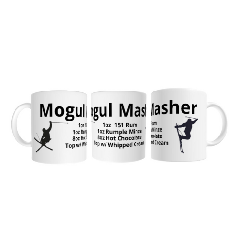 Take your skiing adventures to new heights with our Mogul Masher Mug. This stylish mug features two silhouettes of skilled skiers performing impressive tricks, capturing the thrill and excitement of the slopes. With the words "Mogul Masher" boldly displayed, it's the perfect mug for passionate skiers and winter sports enthusiasts. Not only does it showcase your love for skiing, but it also includes the recipe for the signature Mogul Masher drink, making it a must-have for après-ski gatherings. Enjoy your favorite hot beverage while reminiscing about epic ski runs and planning your next mountain adventure.