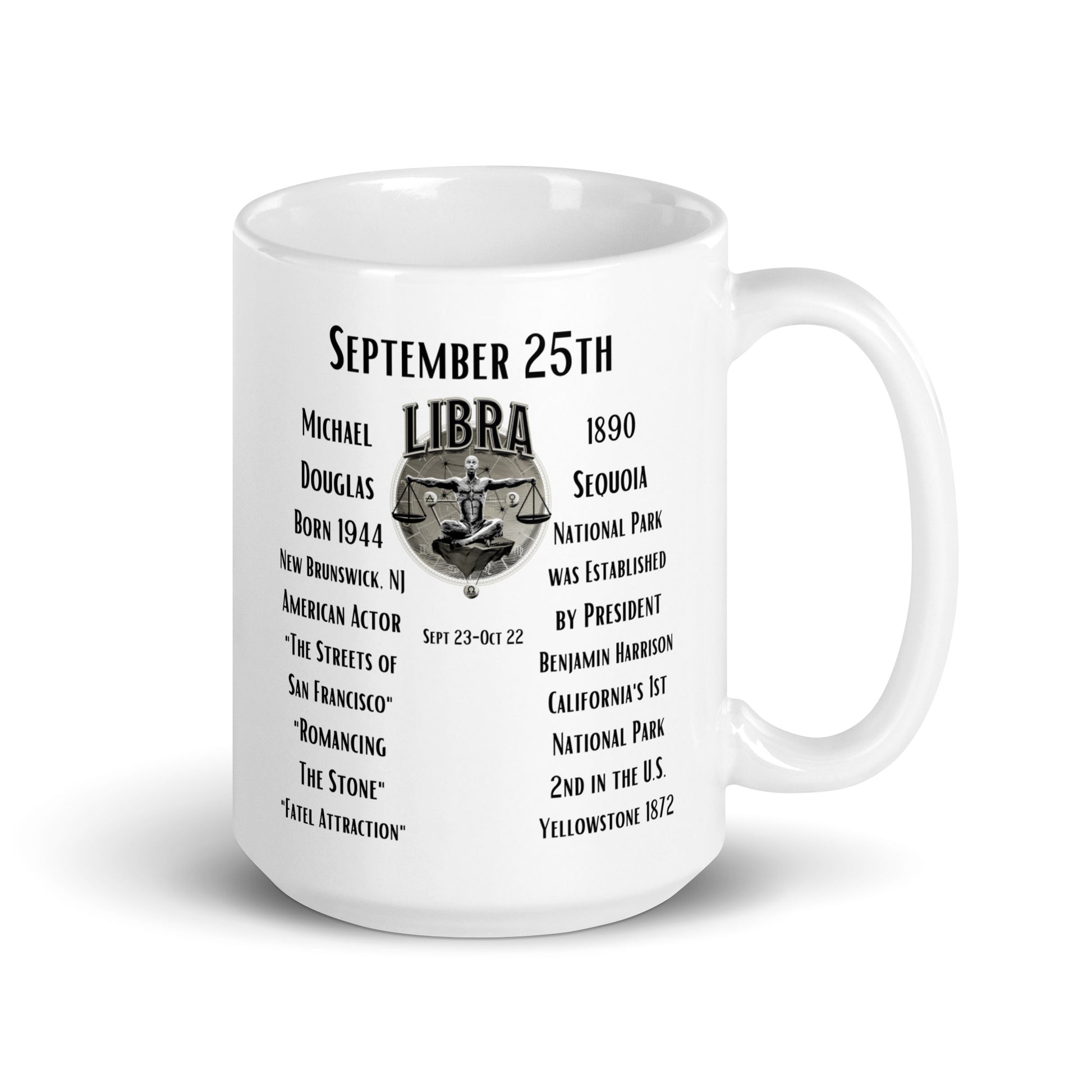 This On This Day Birthday Series mug encapsulates the essence of September 25th, celebrating both the remarkable talent of Michael Douglas and the visionary leadership of President Benjamin Harrison in safeguarding our natural heritage. As a Libra, born between September 23rd and October 22nd, you can proudly display this mug that represents your astrological sign and commemorates the fusion of remarkable individuals and significant historical events associated with September 25th.