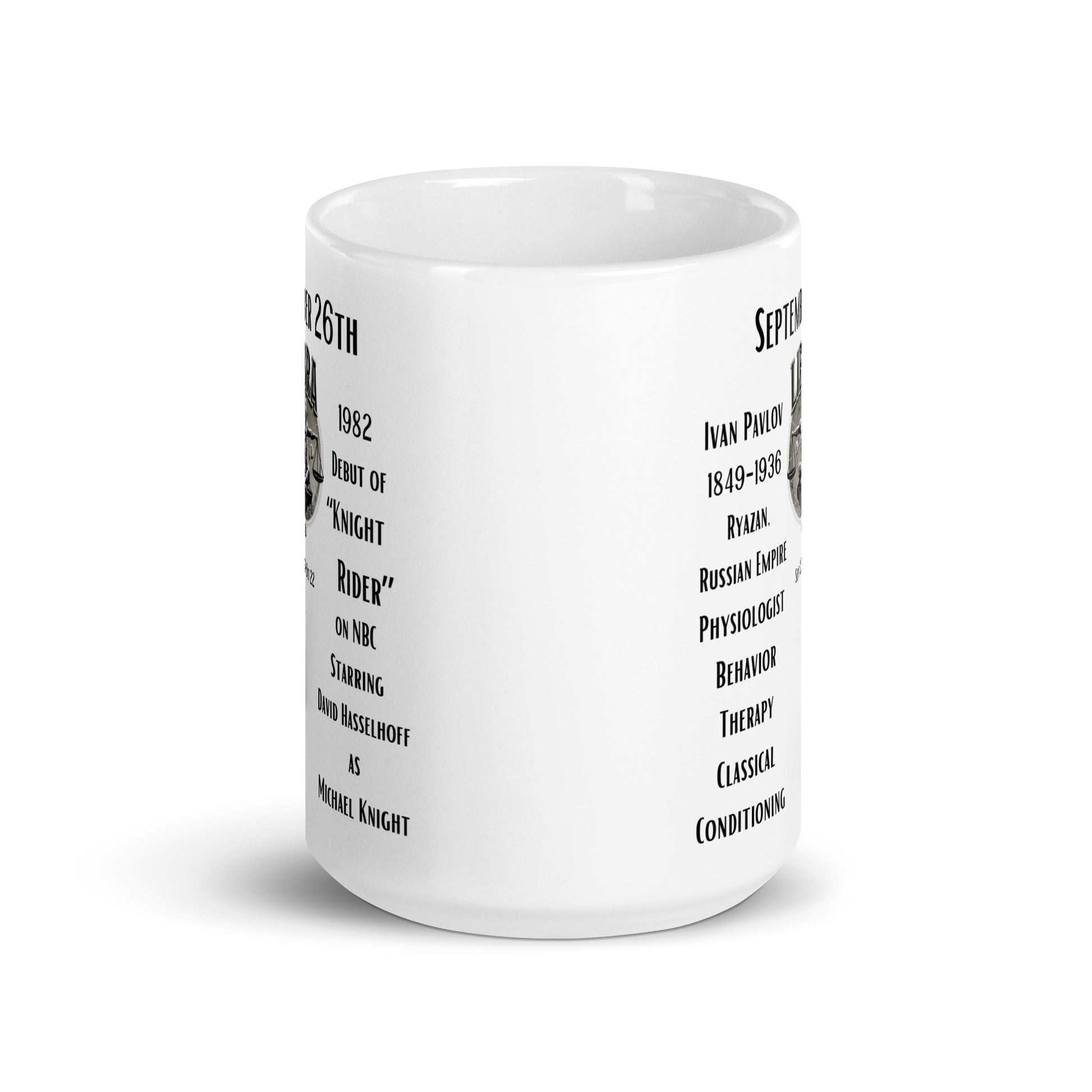 Celebrate September 26th with our "On This Day: Birthday Series" mug, capturing the essence of innovation and entertainment. Born on this day in 1849, Ivan Pavlov, a Nobel Prize-winning physiologist known for his work in classical conditioning, and in 1982, the iconic TV series "Knight Rider" made its debut on NBC, captivating audiences with its futuristic tale. Sip and reminisce about groundbreaking science and timeless television with every use.