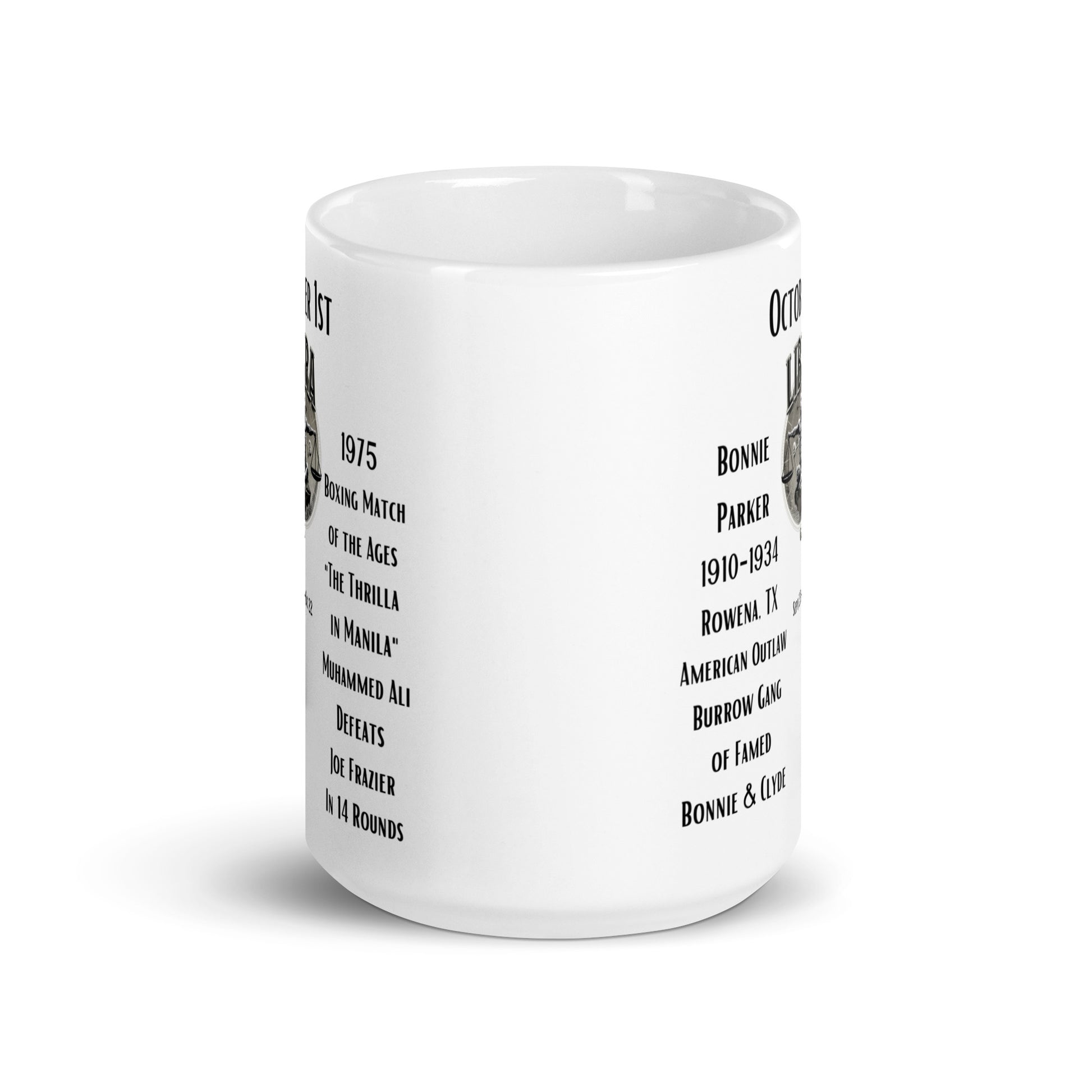 On This Day: Birthday Series - October 01st - (B) Bonnie Parker & "The Thrilla in Manila" - White glossy mug