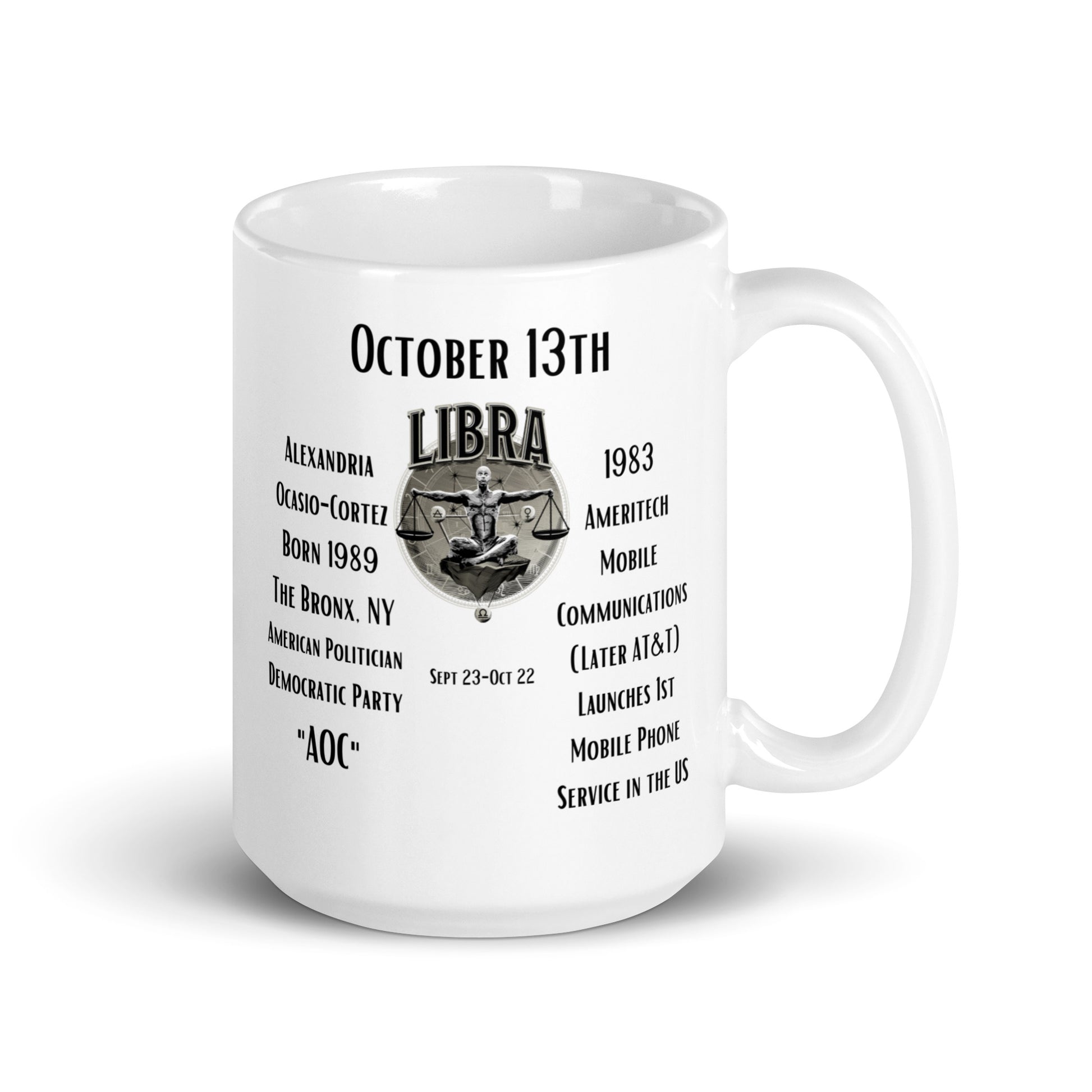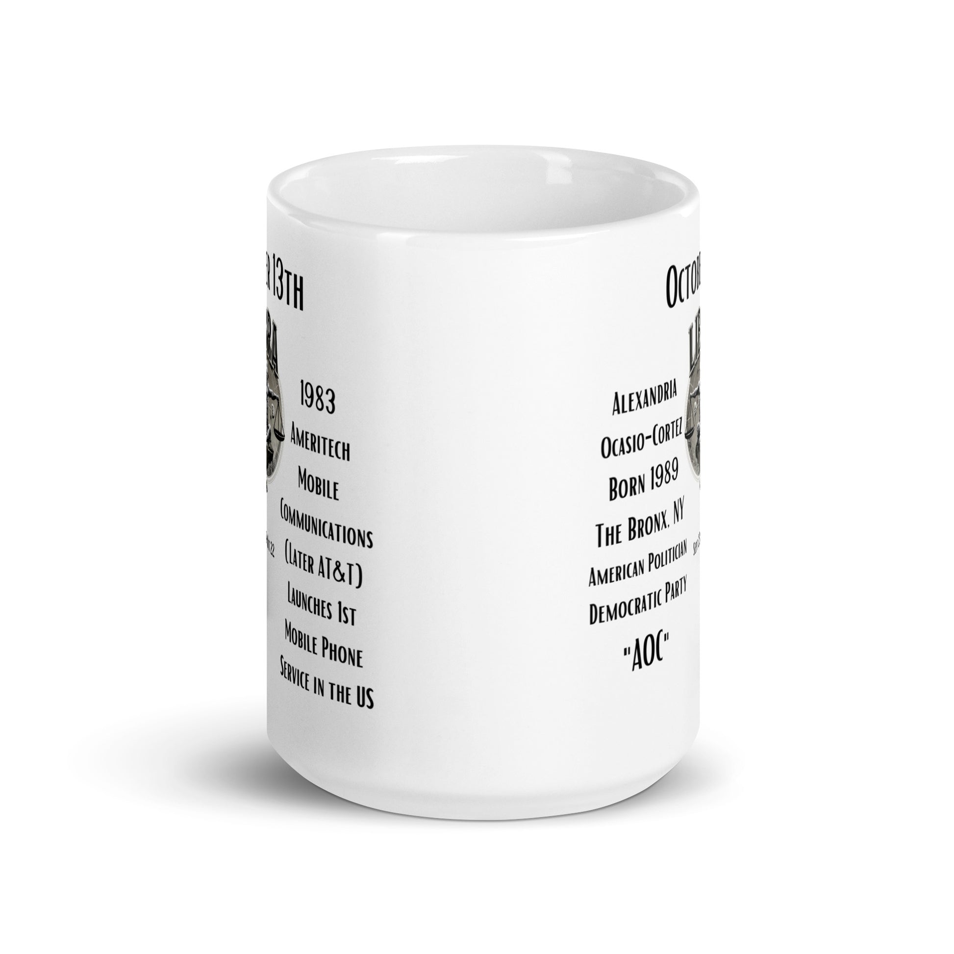 Celebrate your October 13th birthday with our "On This Day: Birthday Series" mug. This unique glossy white mug honors the day Alexandria Ocasio-Cortez, a trailblazing figure in American politics, was born in 1989. This date is also noted for the launch of the first cellular service by Ameritech Mobile Communication, marking a revolutionary moment in telecommunications history. Designed for Libras, this mug encapsulates your inherent charm, tact, and social skills. Perfect for your morning coffee or tea, it not only serves your beverage but also celebrates your unique birth date. Whether it's for you or a gift for someone special, this mug is a perfect way to start a day full of history, technology, and political prowess.