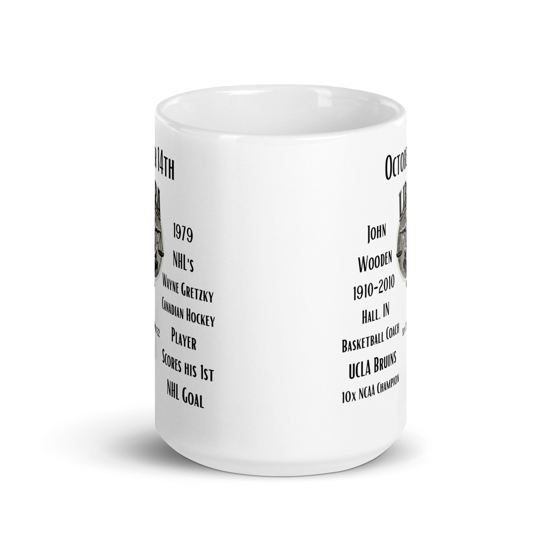 Celebrate your special day with our "On This Day: Birthday Series" mug, designed especially for October 14th birthdays. This unique mug commemorates the birth of the renowned basketball player and coach, John Wooden, born on this day in 1910. It also acknowledges a landmark event in NHL history when the great Wayne Gretzky scored his first goal in 1979. Embodying the Libra spirit of balance and charm, this glossy white mug is an ideal accessory for your daily routine. It makes for an intriguing conversation starter or a thoughtful gift. Enjoy your beverage with a side of sports history and personal significance.