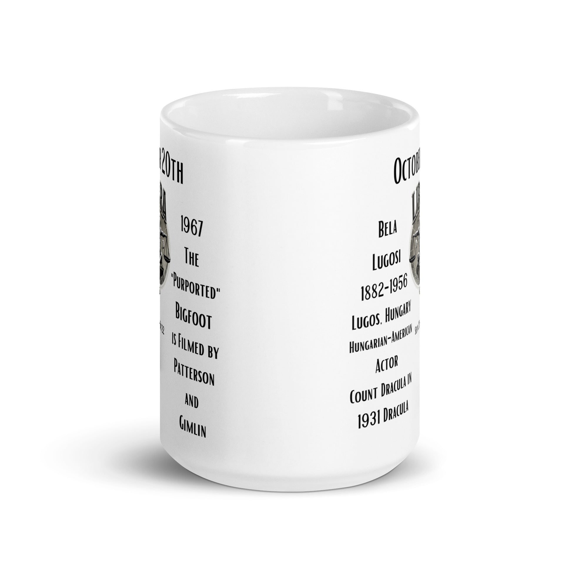 Celebrate the intriguing world of cinema and mystery with our "On This Day: Birthday Series" mugs. Specifically designed for those born on October 20th, this white glossy mug pays tribute to Hungarian-American actor Bela Lugosi, born on this day in 1882, renowned for his iconic role as Count Dracula. Further adding to the charm of this date, on October 20th, 1967, the infamous Bigfoot was purportedly captured on film by Patterson and Gimlin. This mug is an ideal gift for cinema lovers, mystery enthusiasts, or anyone who loves unique historical tidbits.