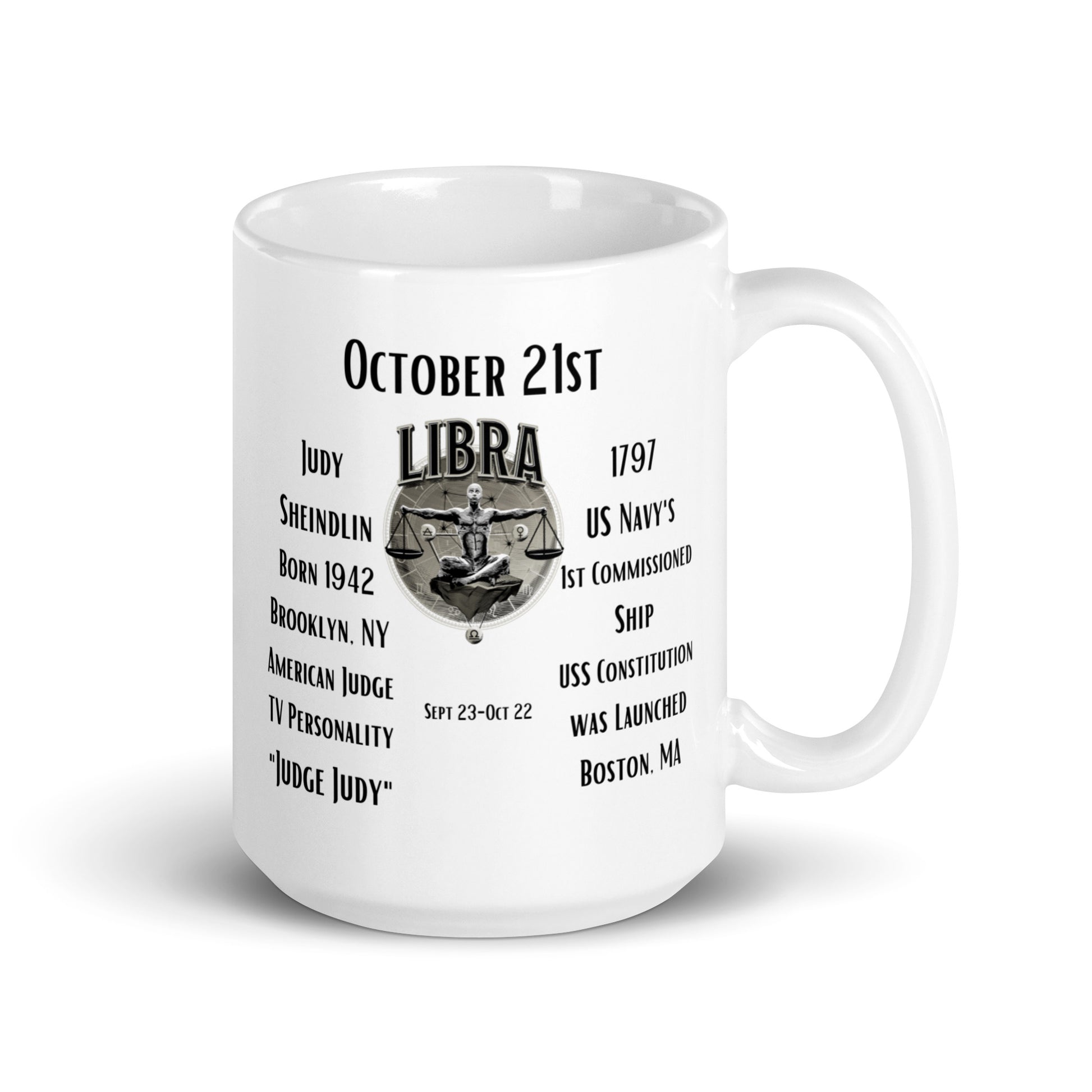 Take a sip from history with this special edition October 21st "On This Day: Birthday Series" mug. On this day in 1942, Judith Sheindlin, better known as Judge Judy, was born. She went on to become a renowned television personality and a symbol of justice for many. On the same date in 1797, the first commissioned US Navy ship was launched, signifying a major milestone in the nation's maritime power. Perfect for anyone who loves history, unique gifts, or has a penchant for the high seas or legal dramas.