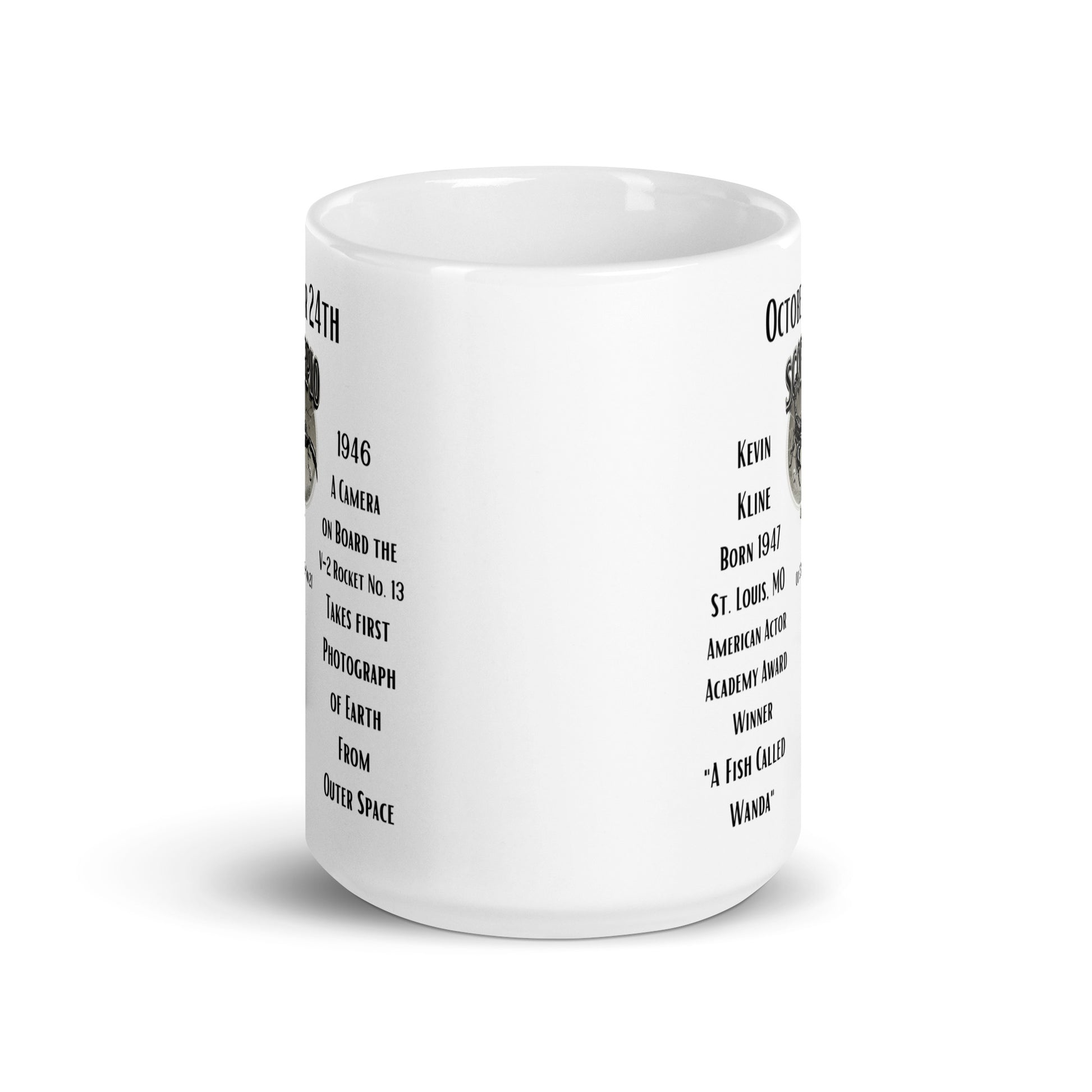 On This Day: Birthday Series - October 24th - (B) Kevin Kline & Earth's First Space Photo - White Glossy Mug