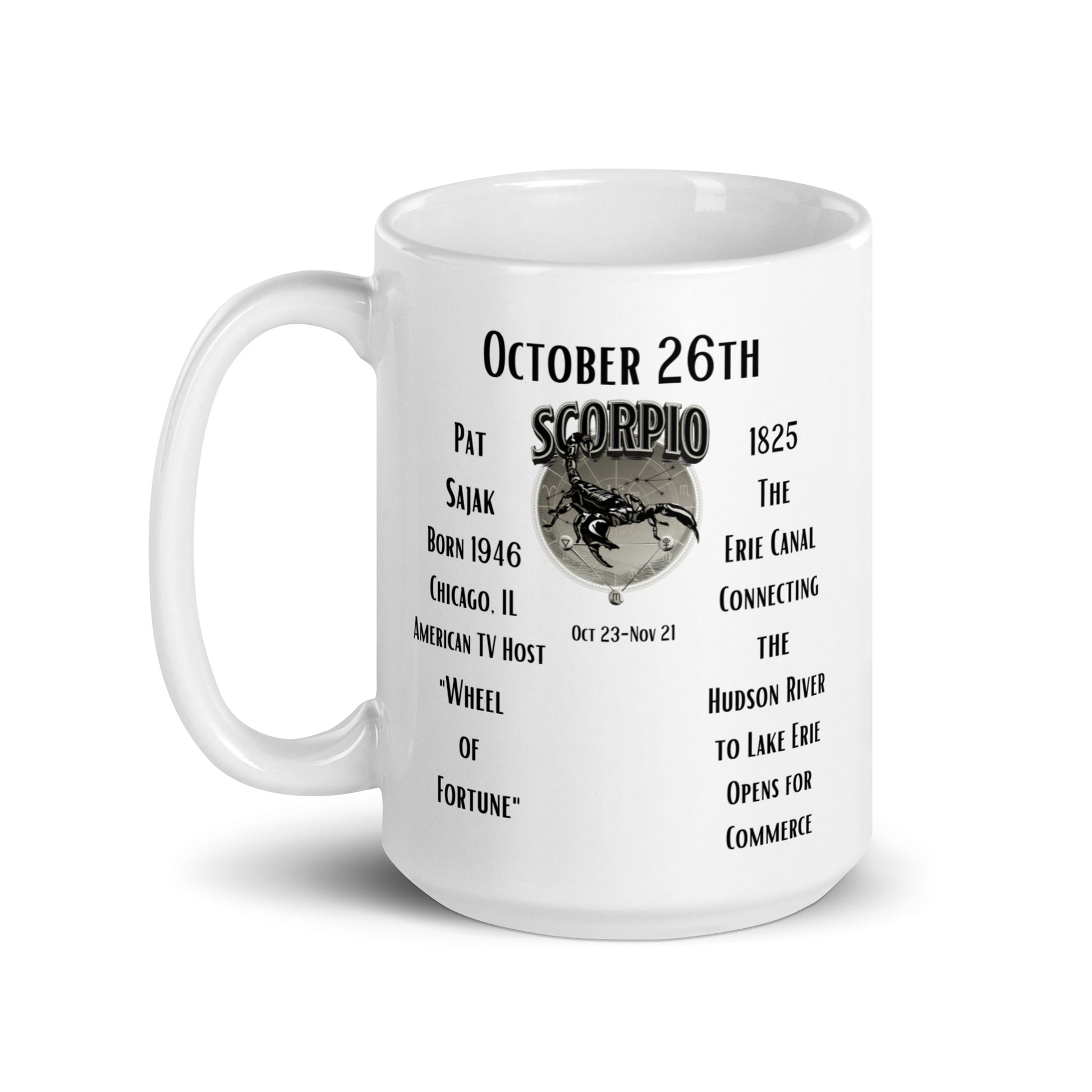The "On This Day: Birthday Series" mug for October 26th is the ideal gift for the history and trivia enthusiasts in your life. This mug celebrates the birthday of renowned television host Pat Sajak, born on this day in 1946, and the historic opening of the Erie Canal in 1825. Enjoy a connection to the past with each sip!
