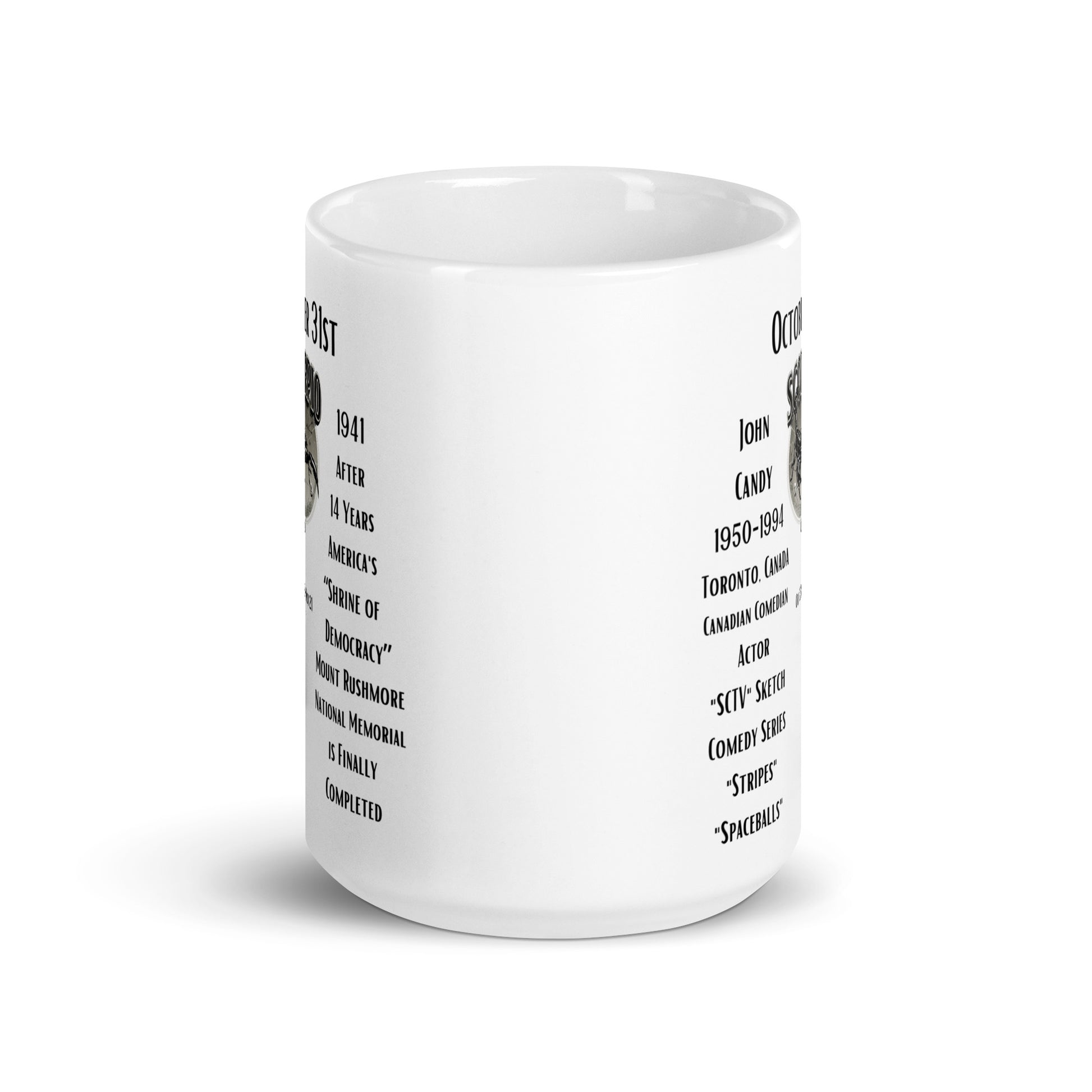 This October 31st mug from our "On This Day: Birthday Series" is a treat no trick can beat! This day marks the birth of legendary comedian John Candy, whose humor continues to bring joy to people around the world. It also commemorates the completion of Mount Rushmore, a remarkable feat of artistry and engineering. The perfect birthday gift for Scorpios, John Candy fans, or those fascinated by American landmarks, this ceramic mug offers a sip of history and a burst of nostalgia.