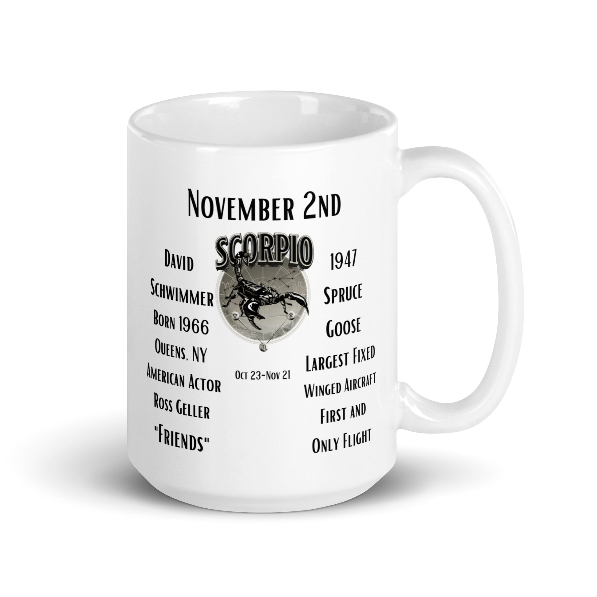 Celebrate your November 2nd birthday with our "On This Day: Birthday Series" mug, specially designed for the dynamic Scorpios. Not only is it your special day, but it is also the birthday of David Schwimmer, famously known as Ross Geller from "Friends," born on this day in 1966 in Queens, New York. Adding to the unique charm of this day, the Spruce Goose, the largest flying boat ever built, made its first and only flight in 1947. Enjoy your favorite beverage in this mug as you revel in these unique historical connections. An ideal gift for yourself or the Scorpios in your life!