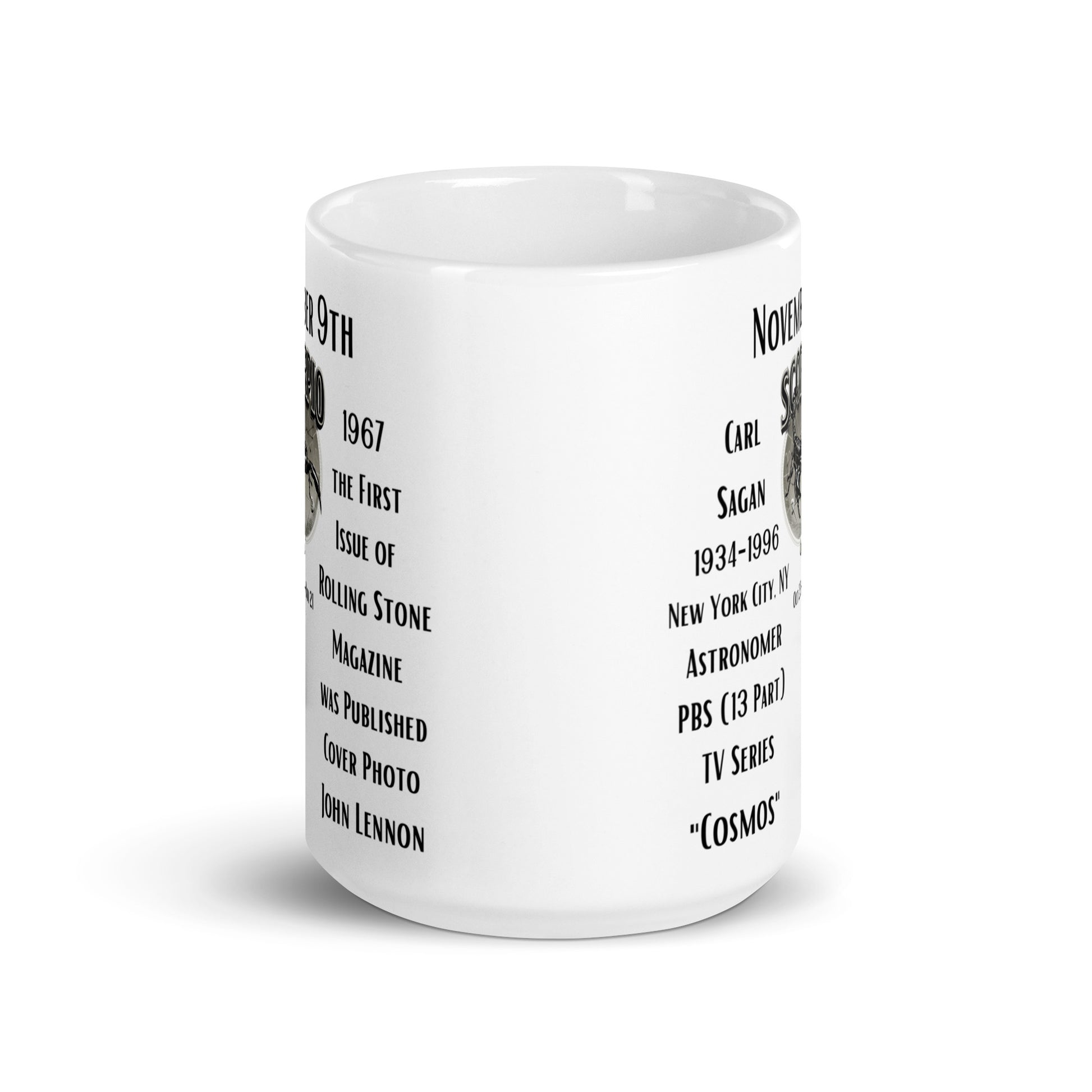 On This Day: Birthday Series - November 09th - (B) Carl Sagan & Rolling Stone Magazine - White glossy mug