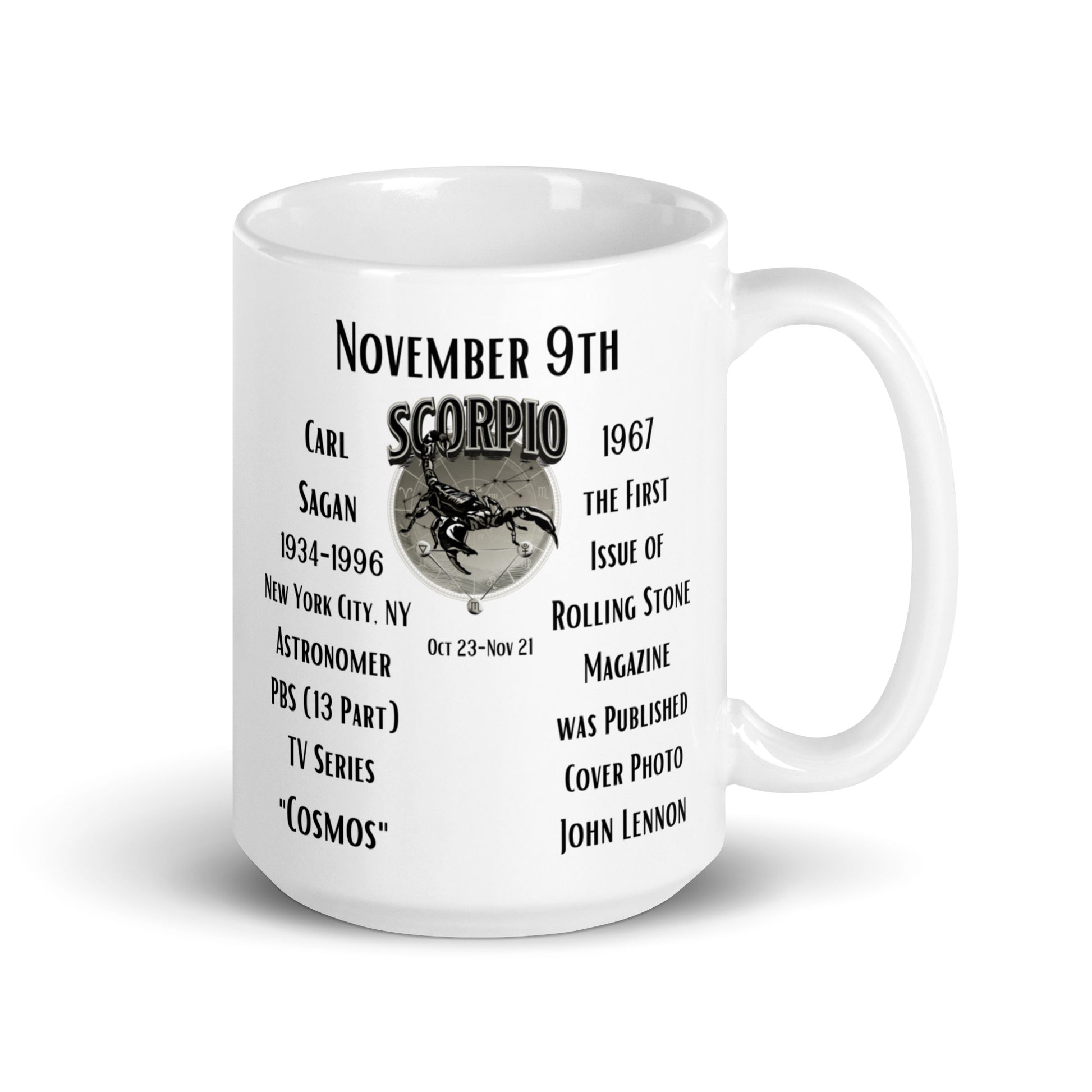 Mark your birthday with our unique "On This Day: Birthday Series" mug, perfectly crafted for those born on November 9th, under the intense and passionate sign of Scorpio. You share your special day with Carl Sagan, the remarkable astronomer and science communicator, born on this day in 1934. November 9th also marks the day Rolling Stone magazine published its first issue in 1967, changing the course of music journalism. Celebrate your individuality and the iconic events of this day with our commemorative mug!