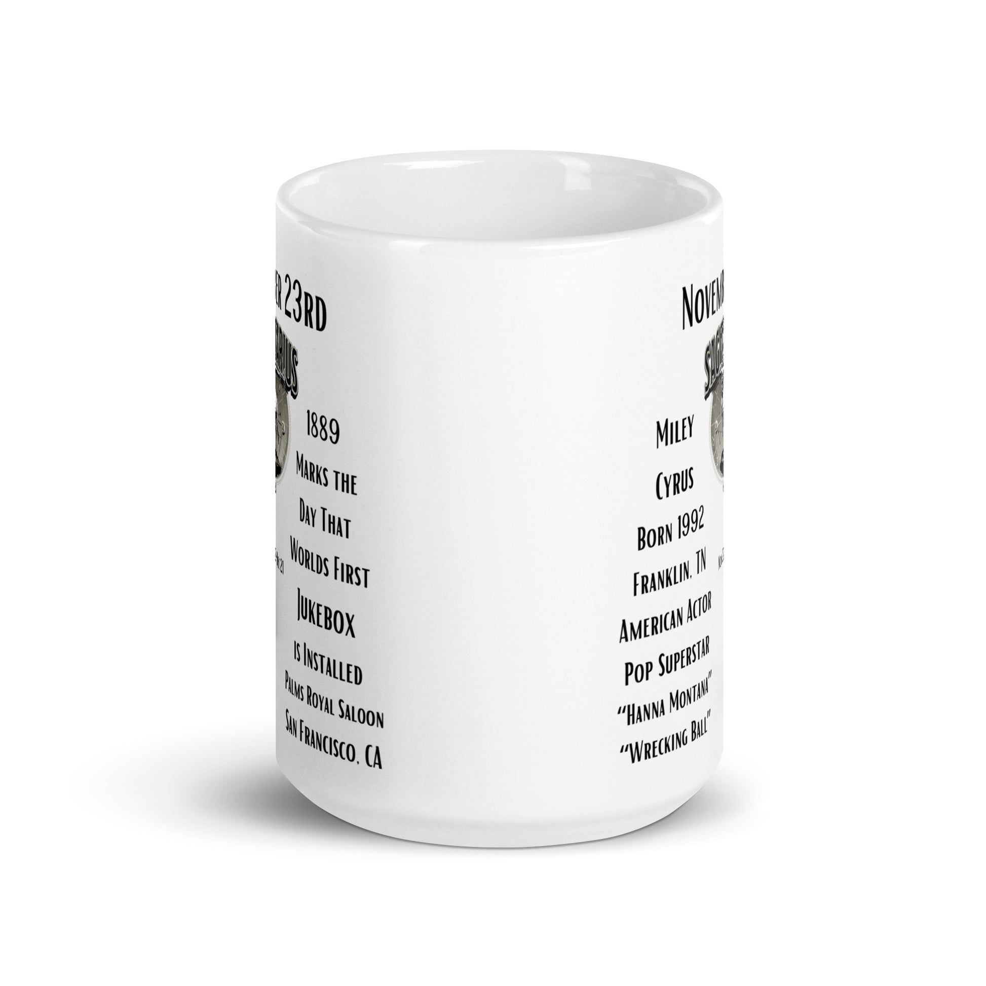Celebrate your November 23rd birthday with the unique "On This Day: Birthday Series" mug! Perfect for Sagittarians, our mug showcases the dynamic Miley Cyrus, born on this day in 1992, and highlights the innovative moment in history when the world's first jukebox was installed in 1889. Start your day with a tribute to the remarkable personalities and events that share your special day.