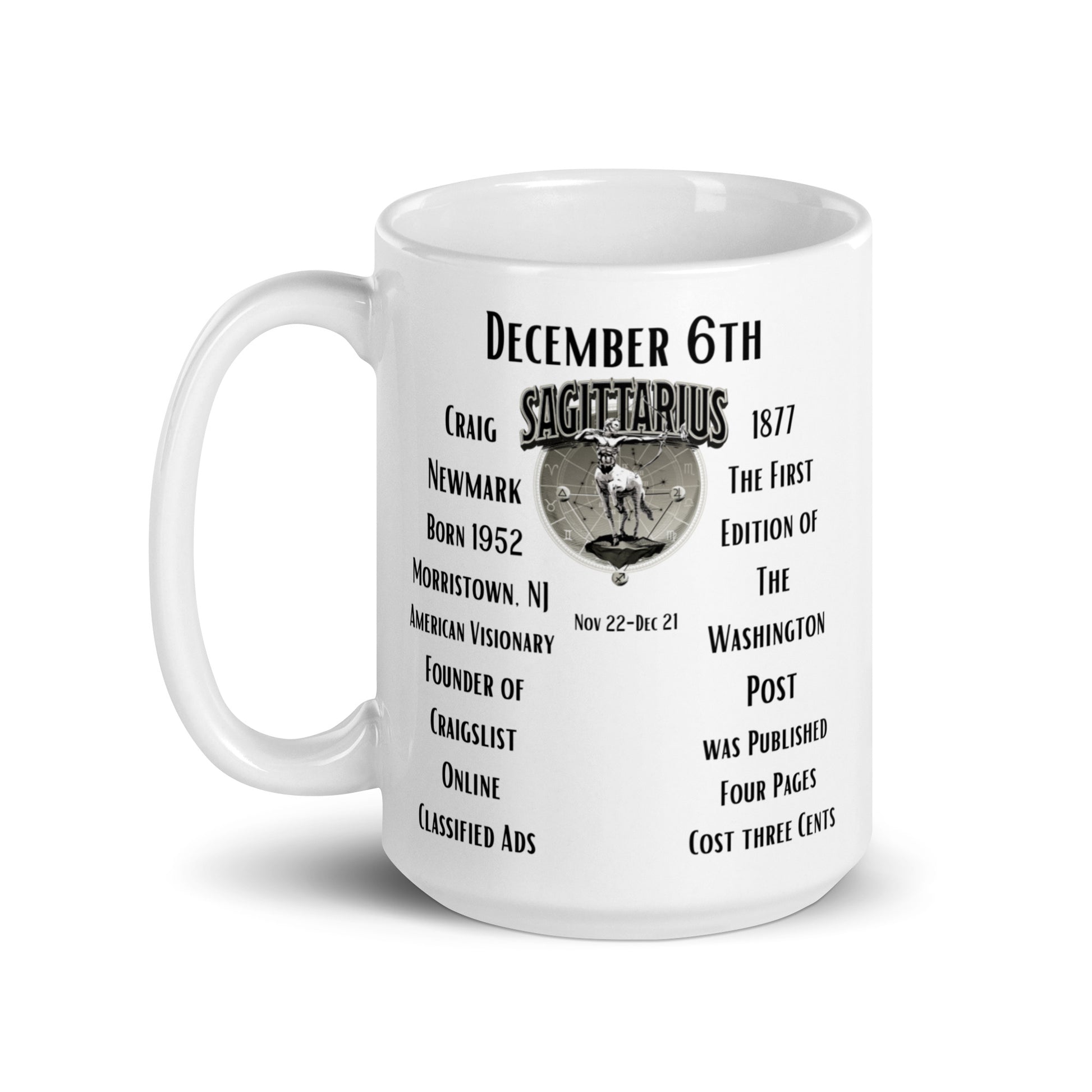 Celebrate the spirit of innovation and the essence of Sagittarius with the "On This Day: Birthday Series" by POD Products 4U. Designed meticulously for those born on December 6th, this mug embraces the energy of the pioneers and changemakers of our times. On this very day in 1952, the world was graced with the birth of Craig Newmark, the visionary founder of Craigslist who reshaped our digital classifieds. Pair that with 1877, the year The Washington Post, an emblem of journalistic integrity and a staple in American media, was established. Sip from this mug and let the tales of entrepreneurship and journalism awaken your own spirit of discovery.