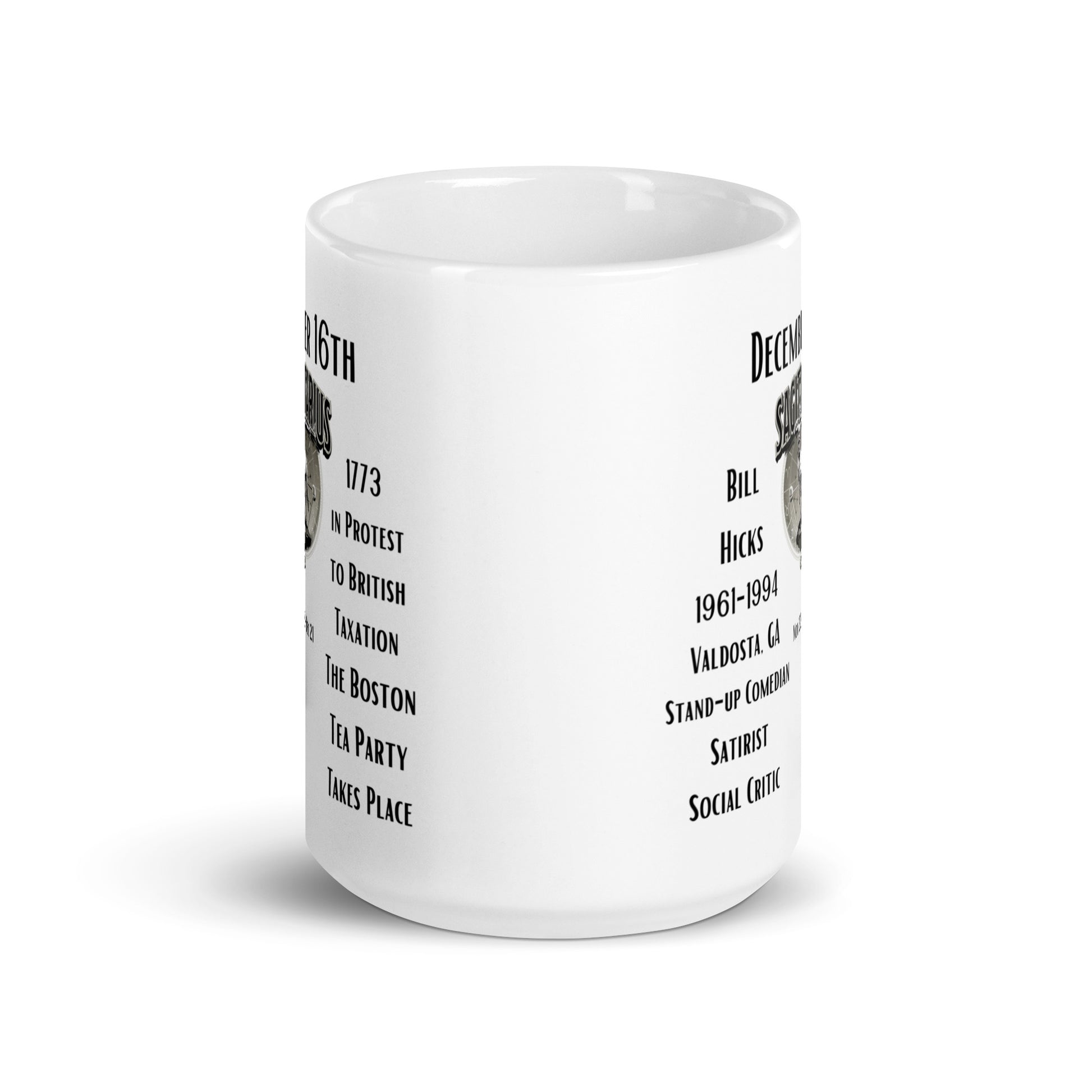 On This Day: Birthday Series - December 16th - (B) Bill Hicks & The Boston Tea Party - White glossy mug