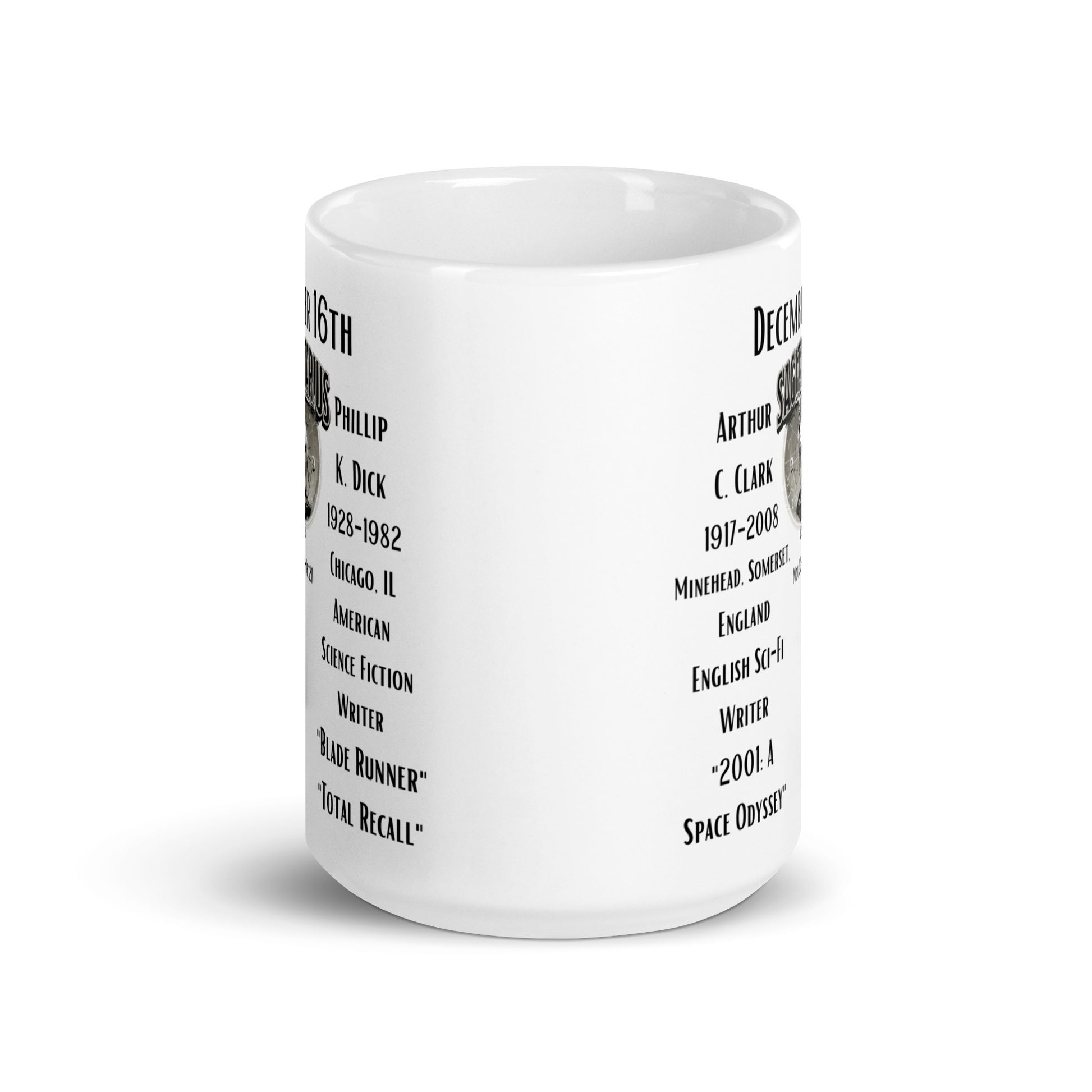 On This Day: Birthday Series - December 16th - (D) Arthur C. Clark & Philip K. Dick - White glossy mug