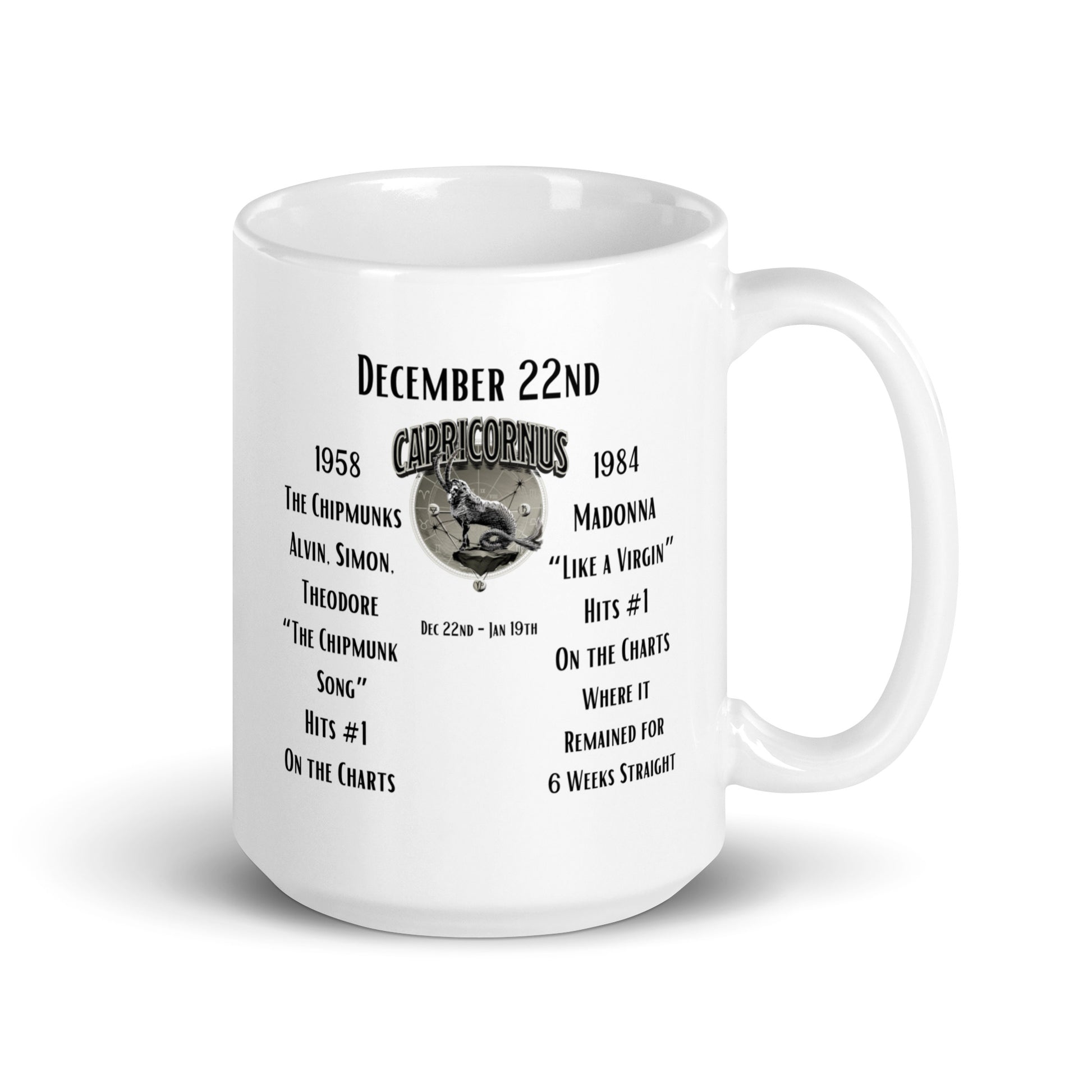 On This Day: Birthday Series – December 22nd, Dive deep into the Ambitious Vibe of Capricorn! Music lovers, this one's for you! On this day in 1958, the world was dancing to the quirky, high-pitched rhythm of "The Chipmunks Song," which climbed its way to #1. Fast forward to 1984, and Madonna's iconic "Like a Virgin" was the tune everyone had on repeat, securing its place at the top of the charts. Every time you take a sip from this mug, let the melodies of the past transport you to these unforgettable musical moments.