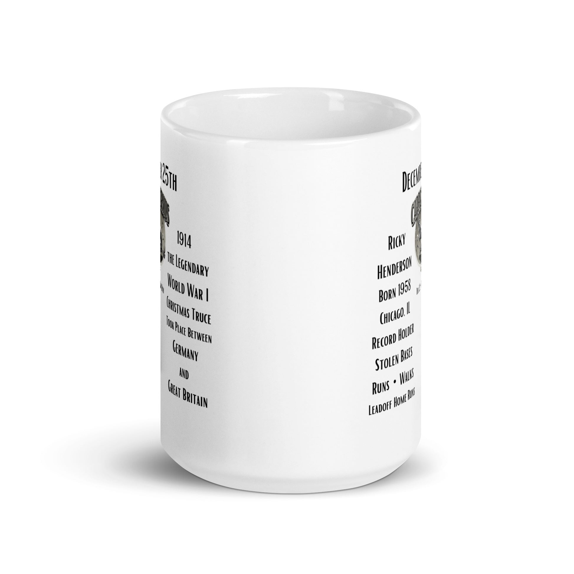 Embrace the exceptional spirit of December 25th! On this renowned date in 1958, baseball legend Ricky Henderson came into the world, setting the stage for his future stolen base records. Moreover, on this very day in 1914, soldiers experienced the magic of Christmas as they laid down their arms in the unforgettable Christmas truce between Germany and Britain. Dive deep into this day's profound mix of sports and peace with our specially designed mug. The perfect gift for December 25th birthdays or for anyone touched by the depth of history.