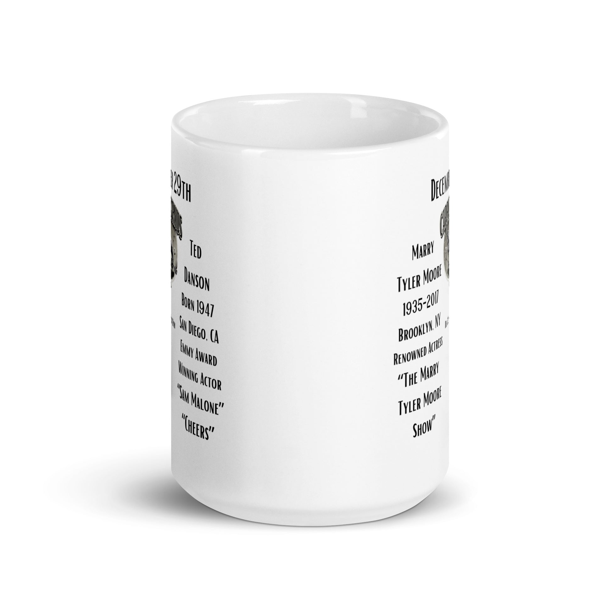 On December 29th, we celebrate the birthdays of two beloved figures in American television. Born on this day in 1936, Mary Tyler Moore became a symbol of independence and charm on the small screen, breaking new ground for women in television with her eponymous show. Sharing this special day, born in 1947, is Ted Danson, known for his charismatic portrayal of Sam Malone in "Cheers" and a long career filled with memorable roles. Both Moore and Danson have left indelible marks on television, not only with their award-winning performances but also with their contributions to the medium. This mug is a tribute to their iconic roles and the legacy they continue to inspire in the world of entertainment.