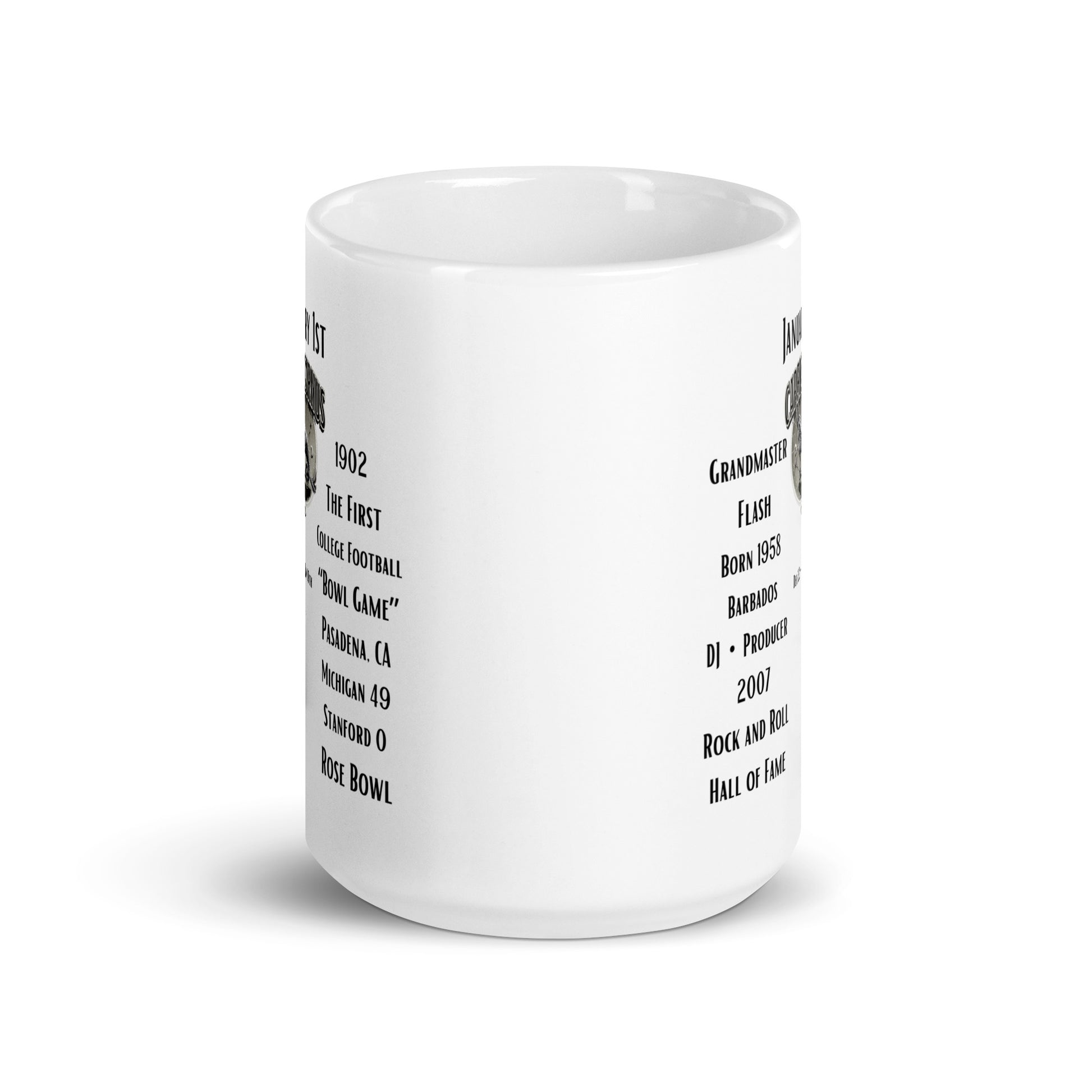 On This Day: Birthday Series - January 01st - (B) Grandmaster Flash & 1st College Football "Bowl Game" - White glossy mug