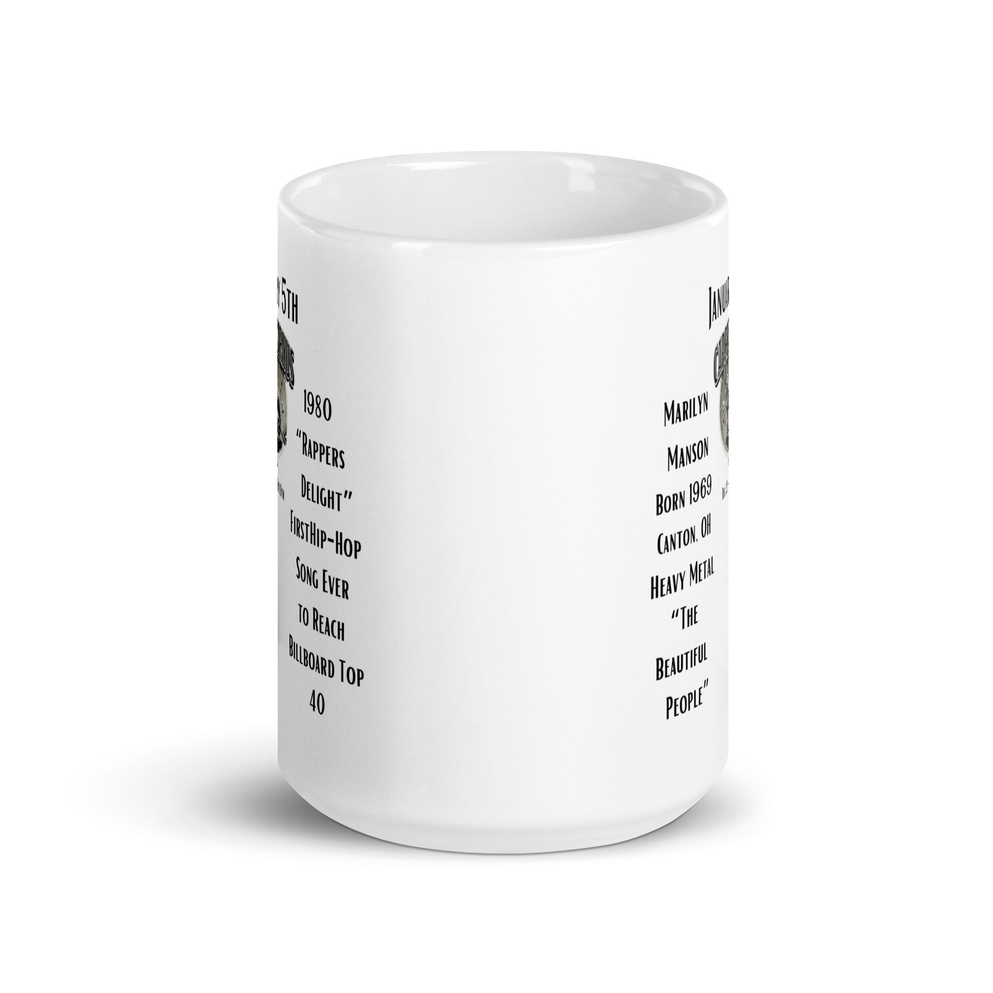 Mark the memorable day of January 5th with our unique "On This Day: Birthday Series" mug. Under the steadfast sign of Capricorn, two diverse icons left their mark. Born in 1969, Marilyn Manson emerged as a provocative force in the world of rock music, pushing boundaries and redefining genres. In the realm of hip-hop, 1980 saw a groundbreaking moment as "Rapper's Delight" by The Sugarhill Gang reached the Billboard top 40, heralding the mainstream acceptance of a revolutionary sound. Celebrate these key moments in musical history with every sip from this carefully designed mug.