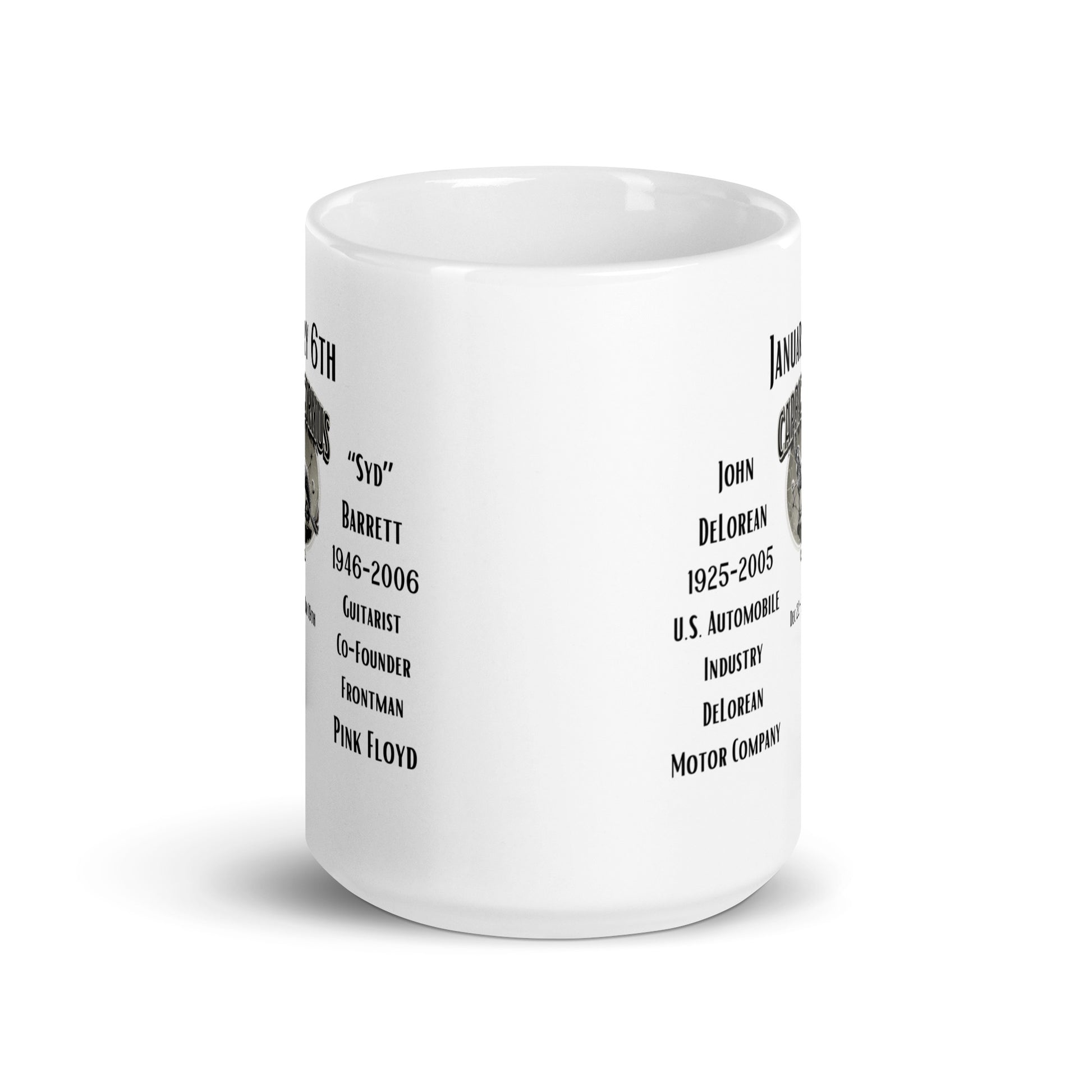On This Day: Birthday Series - January 06th - (B) John DeLorean & Syd Barrett - White glossy mug