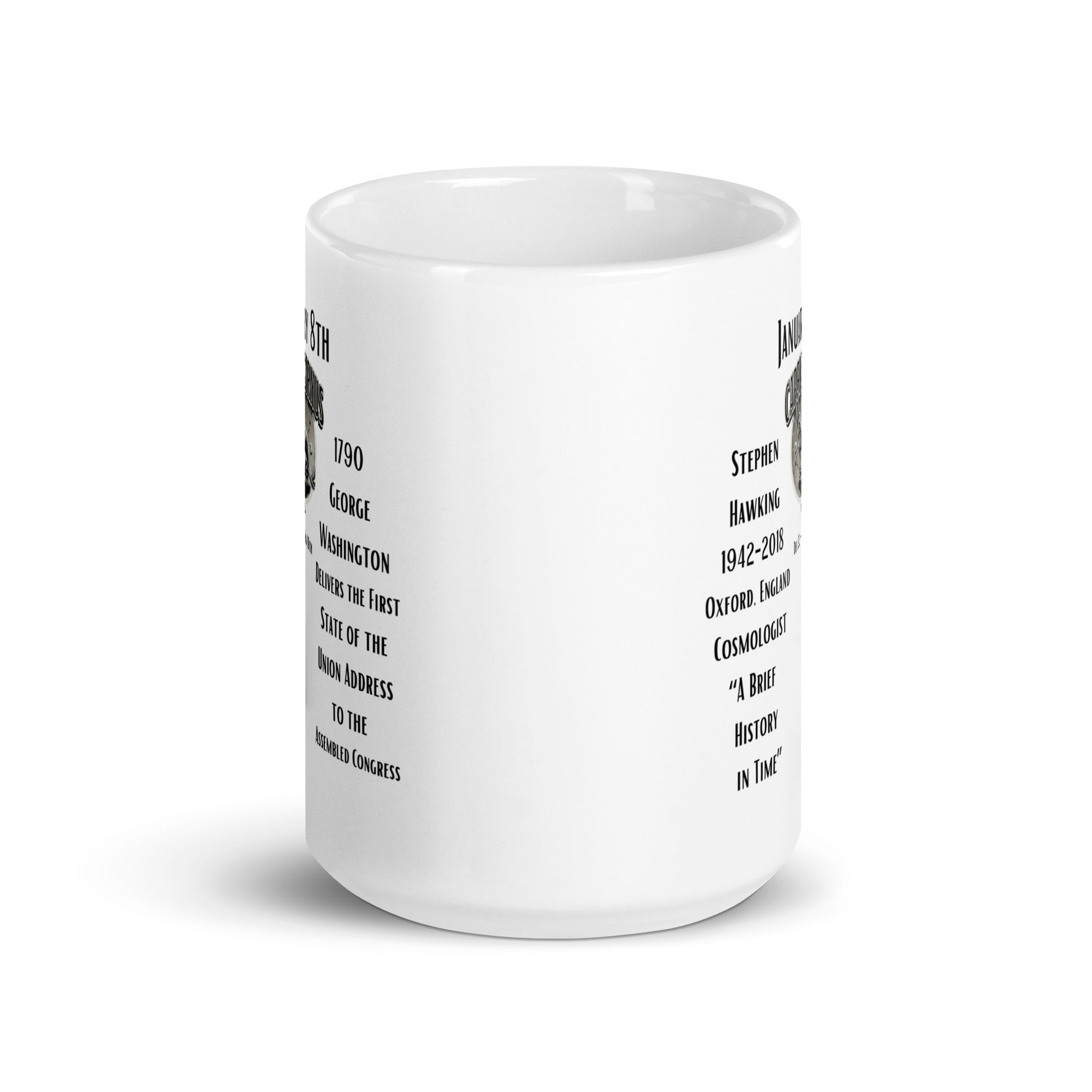 On This Day: Birthday Series - January 08th - (B) Stephen Hawkins & George Washington - White glossy mug