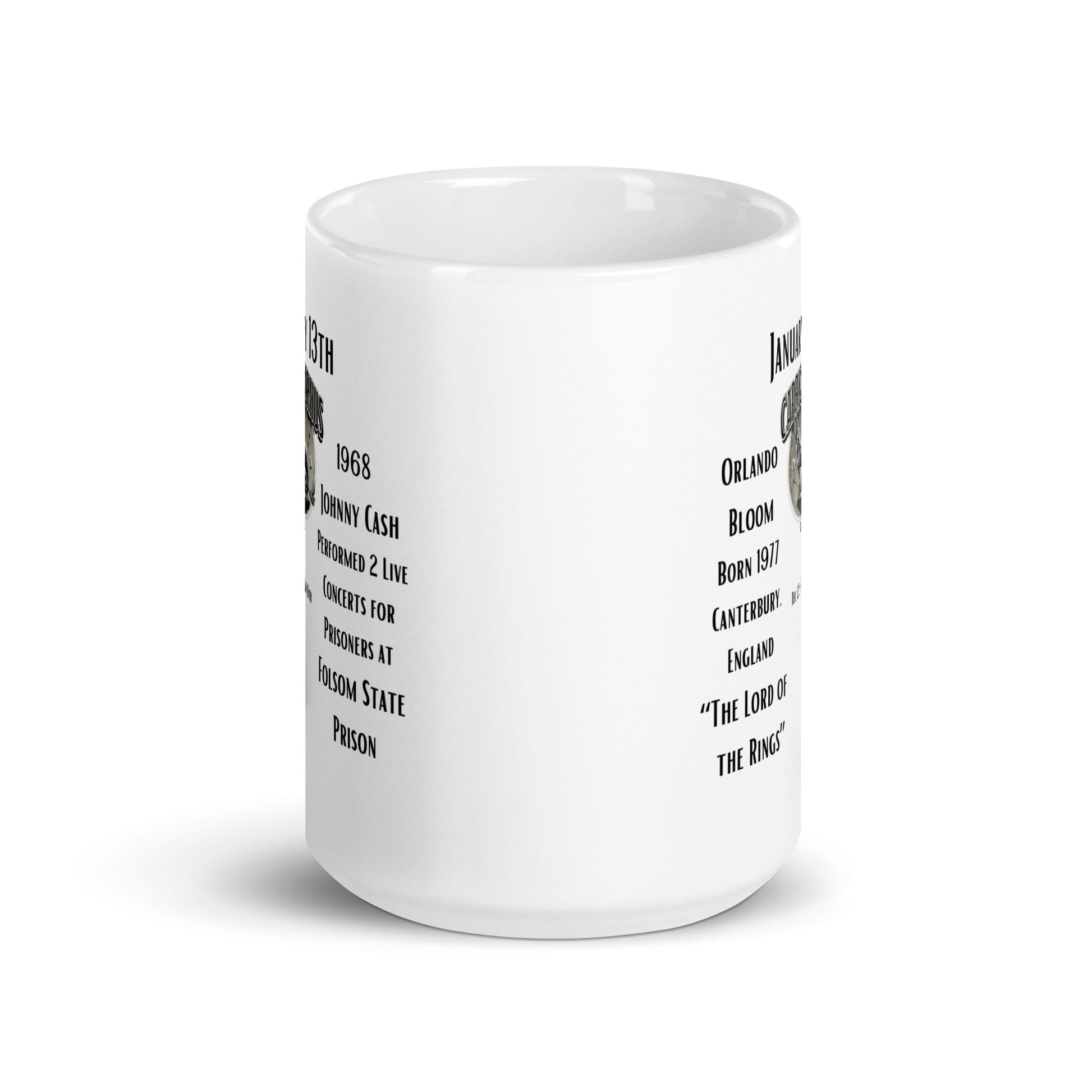 On This Day: Birthday Series - January 13th - (B) Orlando Bloom & Folsom State Prison - White glossy mug