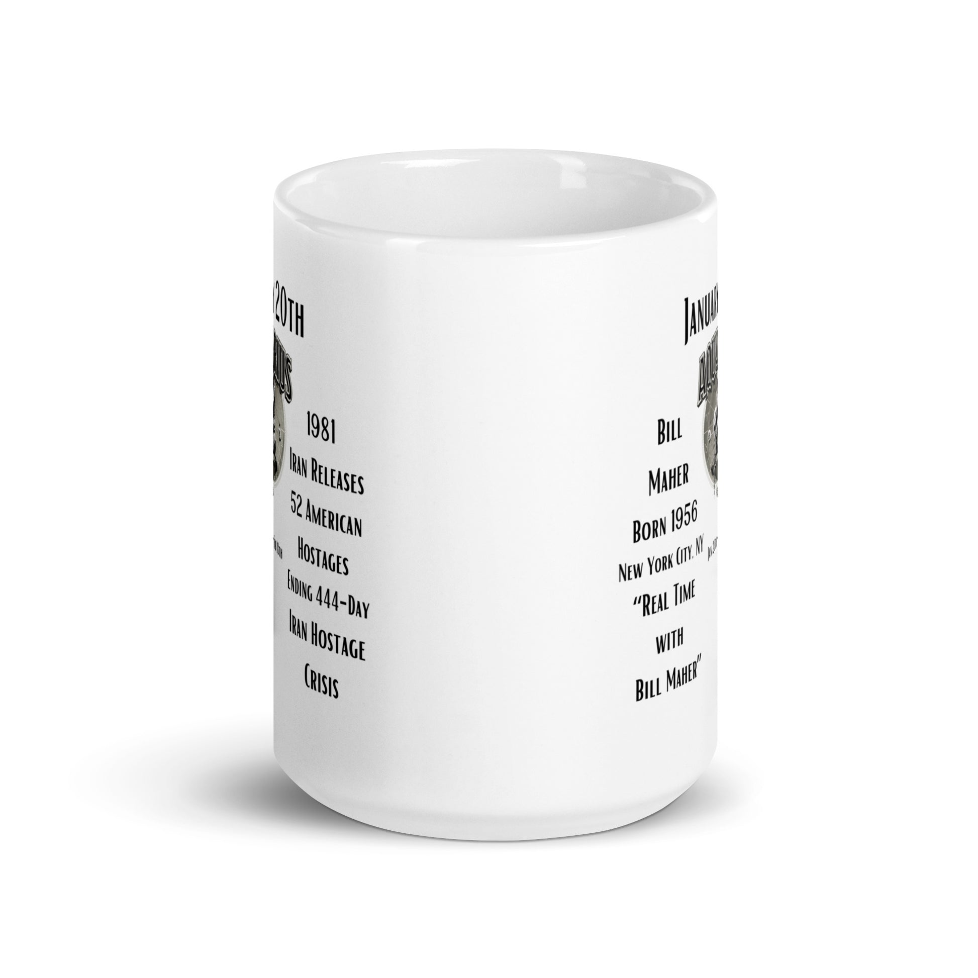 On This Day: Birthday Series - January 20th - (A) Bill Maher & Iran Hostage Crisis - White glossy mug