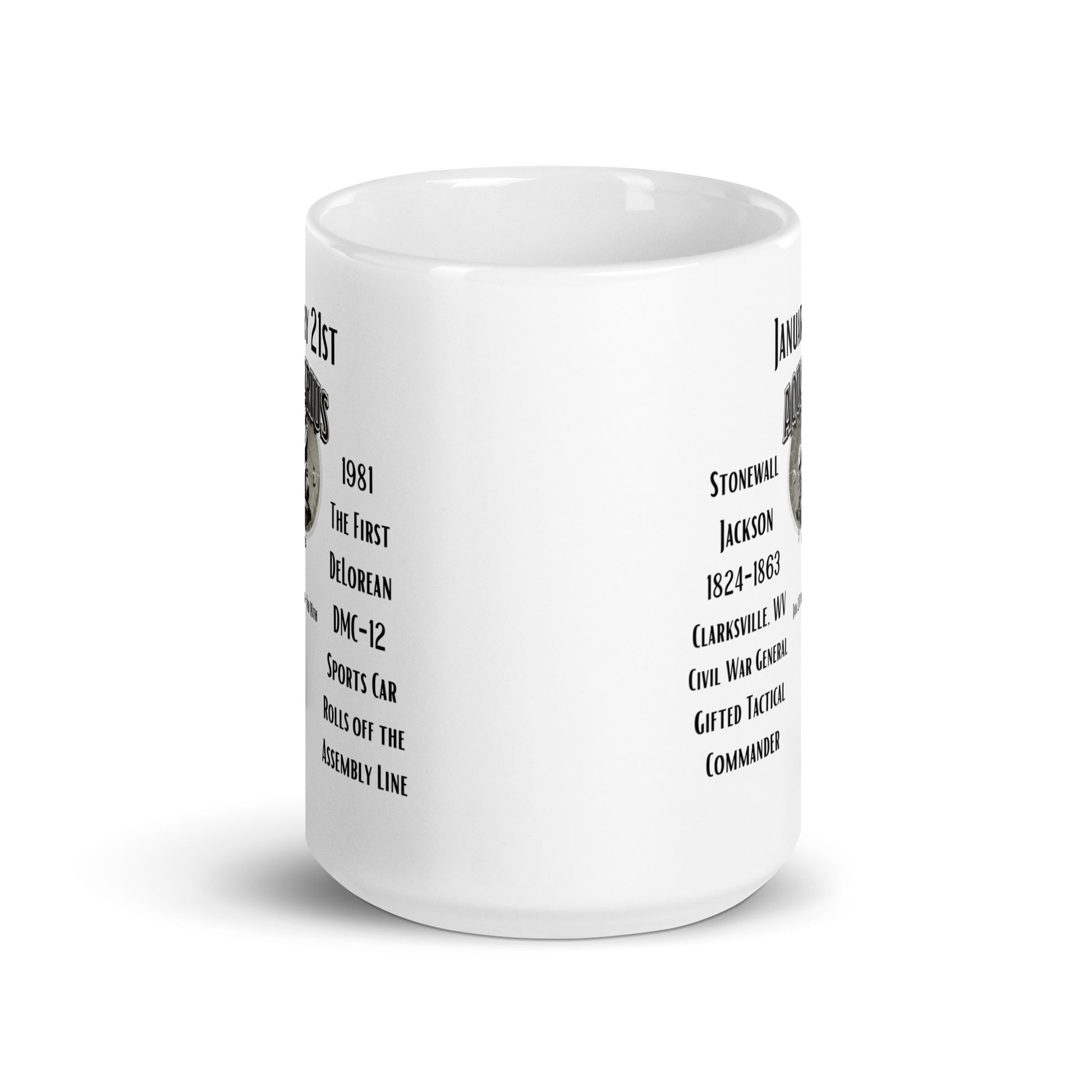 Celebrate the unique and the extraordinary with our "On This Day: Birthday Series" mug, highlighting the significant events and remarkable individuals linked to January 21st. On this day, in 1824, the formidable military leader Stonewall Jackson was born, leaving an indelible mark on American Civil War history with his strategic prowess and indomitable spirit. Furthermore, January 21st, 1981 marked a pivotal moment in automotive history, as the first DeLorean DMC-12 rolled off the assembly line in Northern Ireland, later achieving iconic status through its role in 'Back to the Future'. This mug is a tribute to the innovative and determined nature of Aquarius, making it a perfect gift for history enthusiasts, car aficionados, and anyone drawn to the stories that have shaped our world. Embrace the spirit of discovery and reflection with each sip, and let the "On This Day: Birthday Series" mug connect you to the past's incredible moments and figures. Enjoy your beverage while basking in the legacy of greatness and innovation that January 21st represents.