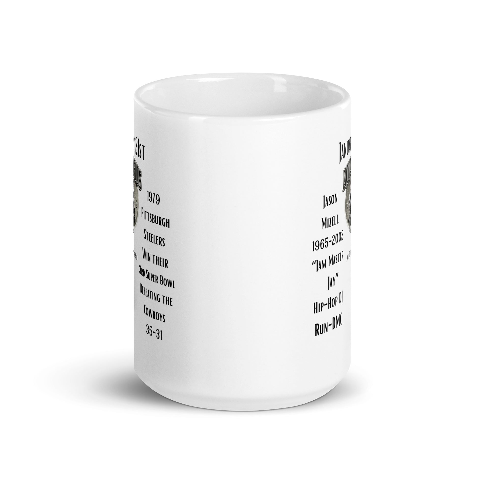 On This Day: Birthday Series - January 21st - (B) "Jam Master Jay" & Pittsburgh Steelers - White glossy mug